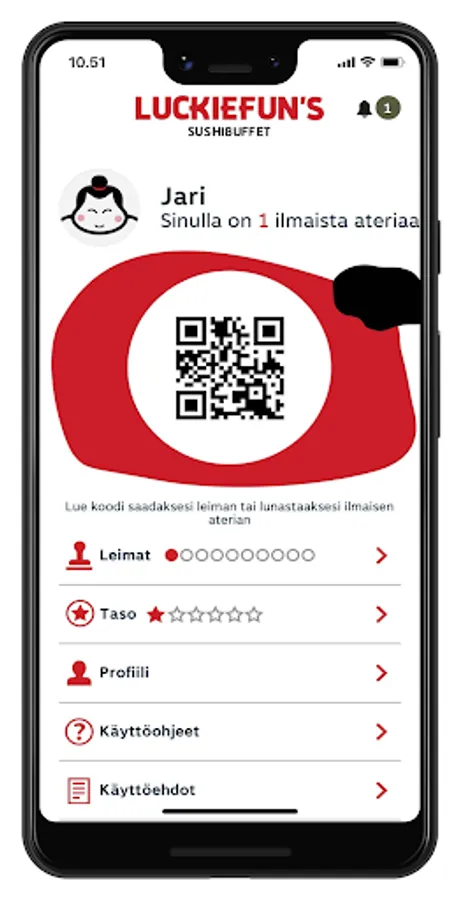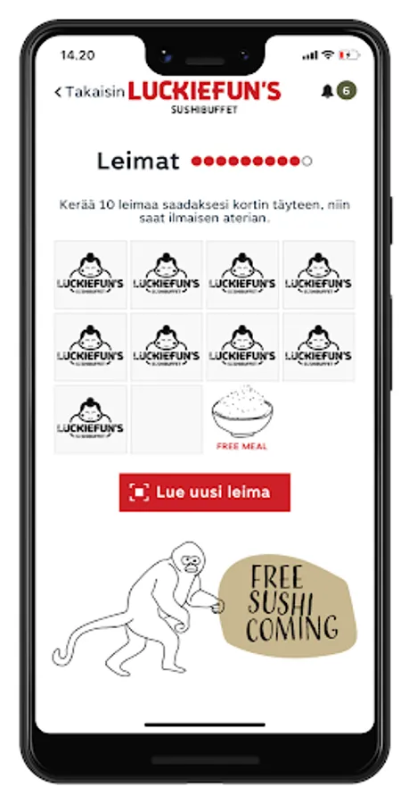 Luckiefun loyaty rewards App. Collect stamps and start earning free Sushi-meals. Collect a full stamp card and earn 1 free sushi meal. Collect more stamp cards moves you up levels to earn even more sushi