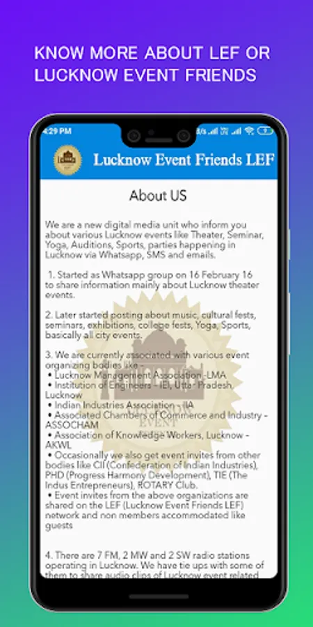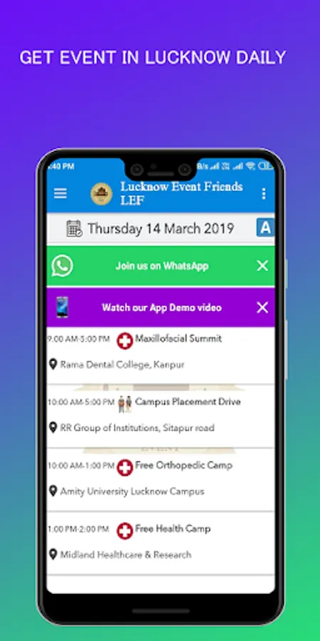8. Outdoor hoardings get covered via our network. For example if a city mandir has organized a bhajan kirtan program OR a hospital is offering a free check up camp and put a hoarding somewhere, if someone from our Lucknow event friends network notices it, he clicks a picture a share’s it on the app. This informs many more people about the event who do not live in that area or did not notice the hoarding. It also saves money for the event organizer as now they don’t have to put up hoardings at multiple locations.