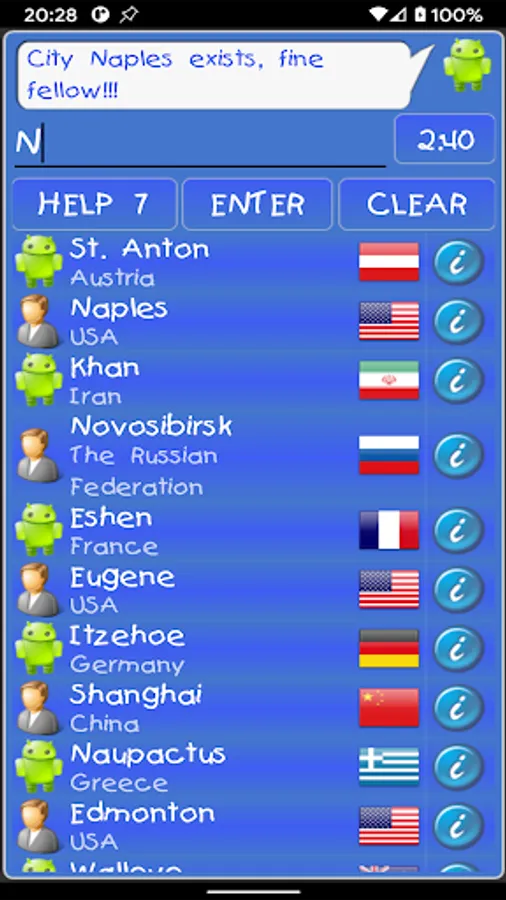 In this game, you play with the app and write a real city of any country, the name of which begins with this letter, which ends with the name of the previous city. The previously named city cannot be reused. At the beginning, the app selects any city. During the game, you can use the reference material. The game ends when you run out of time to answer or at your request. You can choose Russian or English language in which you will play.