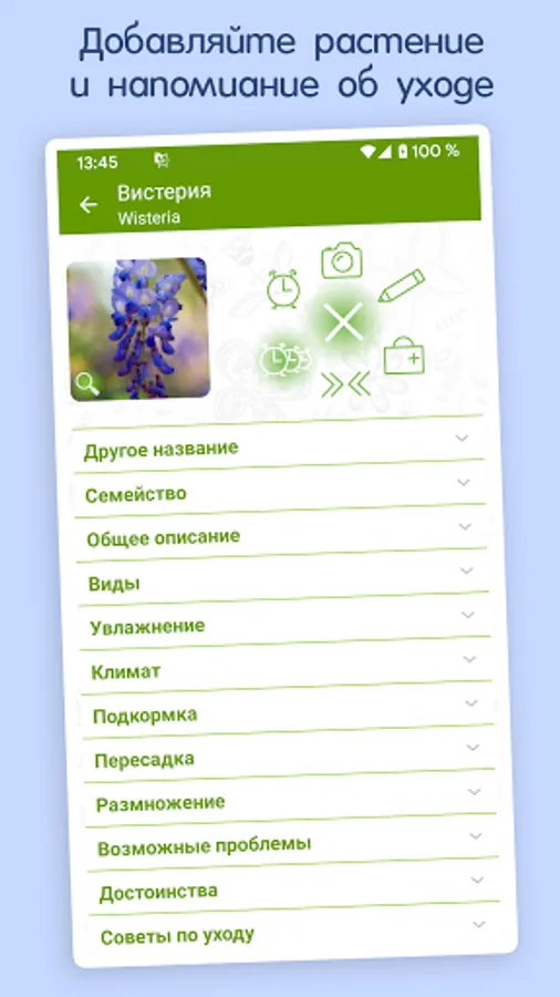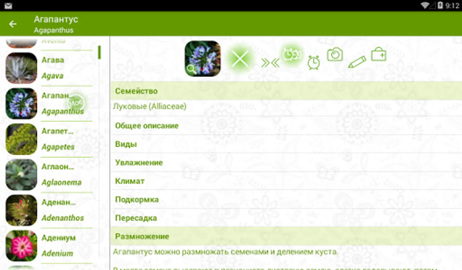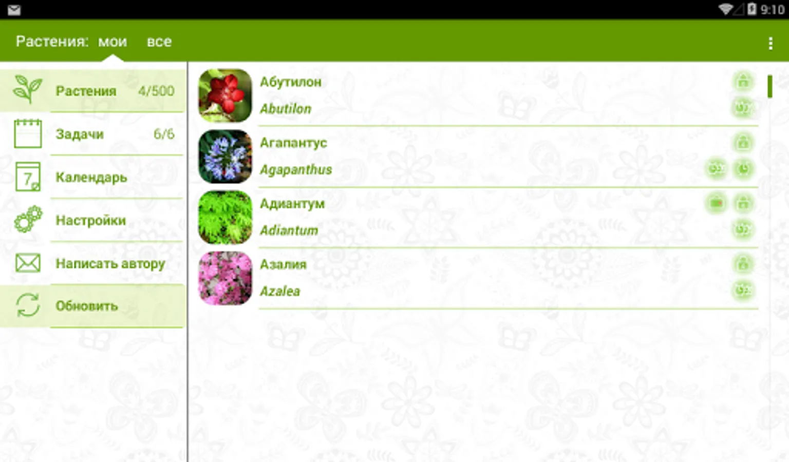 The indoor plant manager will help you organize the care of the plants (watering, spraying, fertilizing, pruning, transplanting, treating diseases) and will remind you at a given time. There is a detailed description of care and treatment. Currently, the application contains 501 plants.