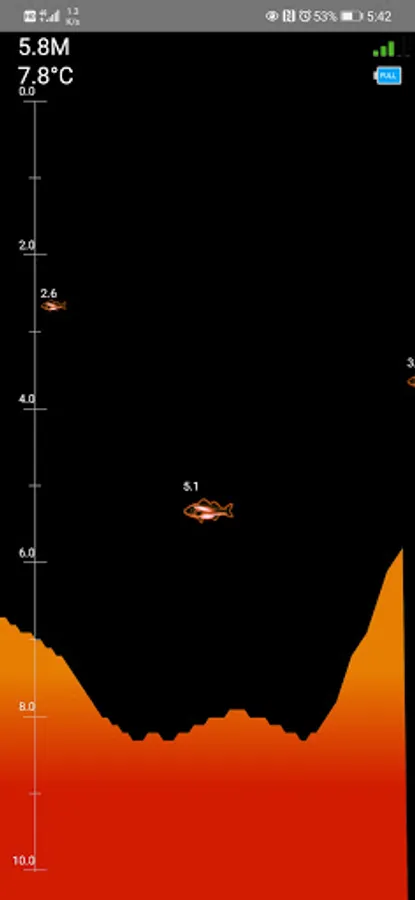 本APP是通过WIFI连接声纳探鱼器探头,并和声纳探鱼器探头进行数据通讯,从而得到水深、水温、鱼群深度、鱼群等信息;能够帮助人们在垂钓过程中分析是否有鱼以及鱼群所在的水层。