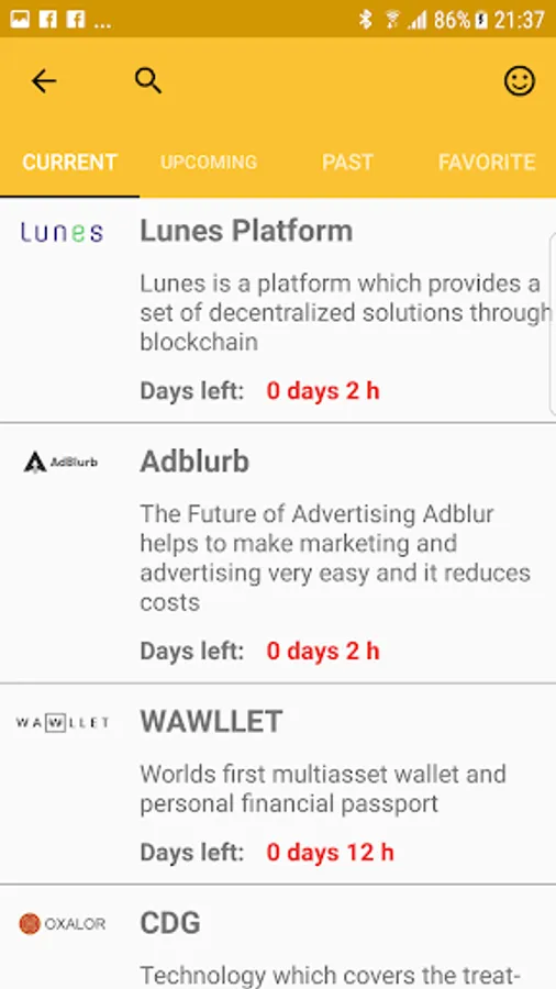 In our app you can find information about such ICOs as Modern Finance Chain, Cloudbric, Vite, Verifier, DINNGO, Lynked.World, Raido Financial, Verv (VLUX), Bithemoth, Football Bitcademy, MOBU, Gigzi, HUSSY io, SaltMine RONALDINHO SOCCER COIN, Empleos.io, Perlin, Powerchain, CCET Project, 100Tokens, Svper, Vibeo, SamBanx, Wyzerr, PlayChip, dona, Black Insurance, Giza Device, Curaizon, 8 Circuit Studios – Wave 2, NHCT, Boomstarter.Network, GNY, Argyle Coin, Miner Edge, KamaGames Token Sale. Not an, VogoV, JULLAR, Smart Trip Platform, LUDCOIN, RevenYOU, REBGLO, RecordsKeeper, GOeureka, Buying.com, Arianee, One+1, AIAR, Tanibox, LaneAxis, genEOS, Treon, Dominium, GaxCoin, Superwallet, PRIMARY,