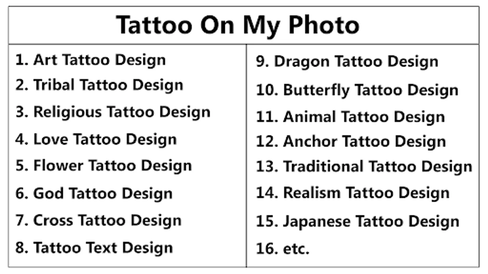 Tattoo my photo App is tattoo maker easy to use and look realistic tattoo by no pain, come with variety of beautiful realistic 100+ tattoos