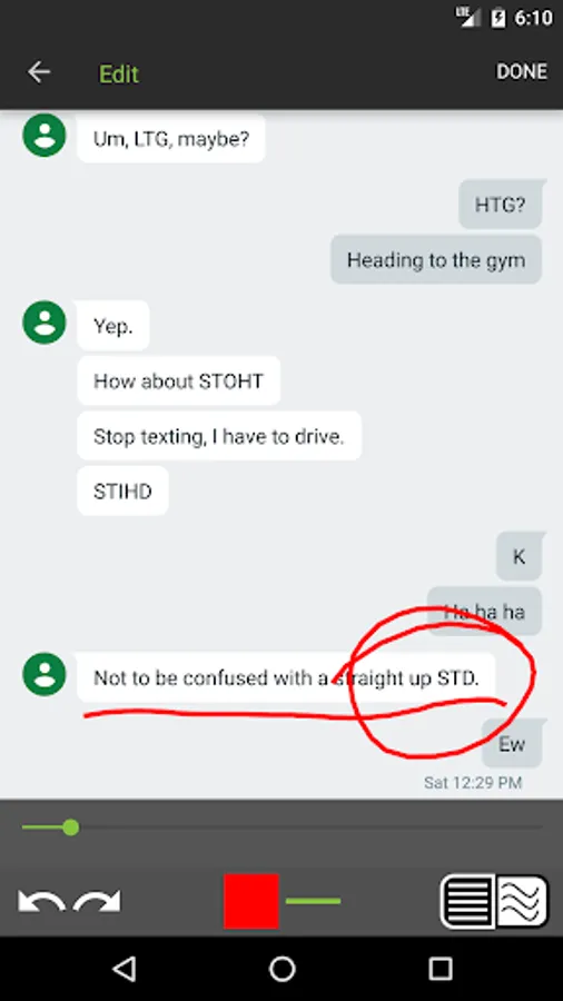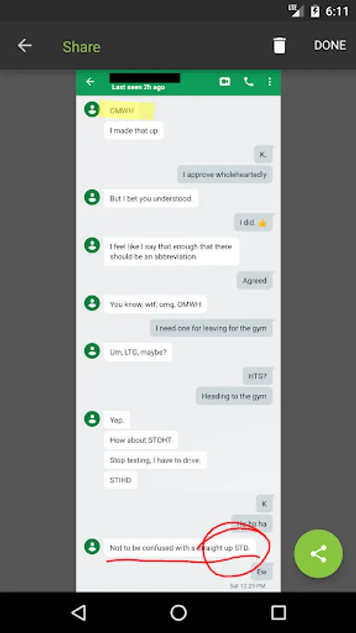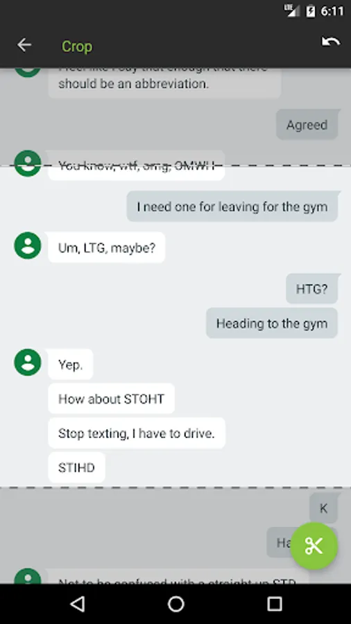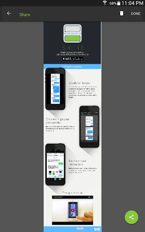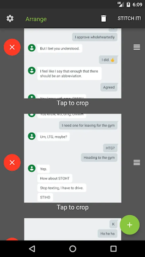 Stitch It! allows you to create one seamless image of a text message conversation so that you can share it via WhatsApp, email, Facebook, Twitter, Reddit, Tumblr, or anywhere else in the series of tubes that is the webernet machine.