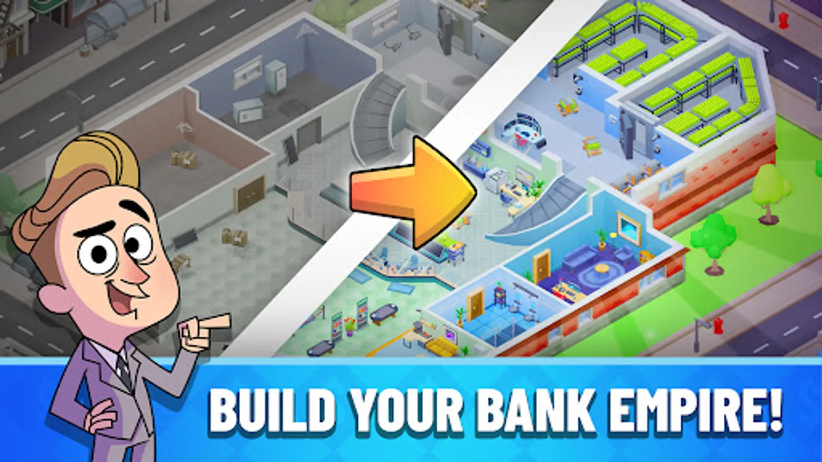 It is a brand-new idle tycoon game. In this idle simulation game, you start running a small bank and working hard to manage, and expand your facility to chase a big dream: building a bank empire!