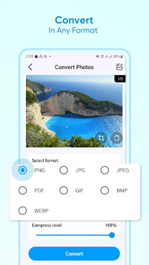 Convert images to JPEG, png to jpeg, webp to jpg or other formats with Image Converter - Photo Resize app.