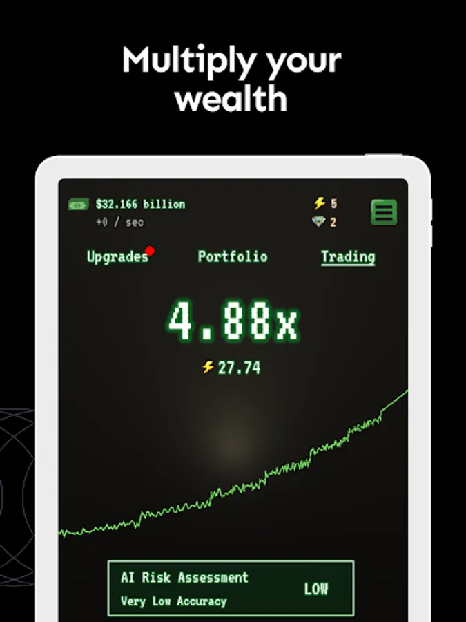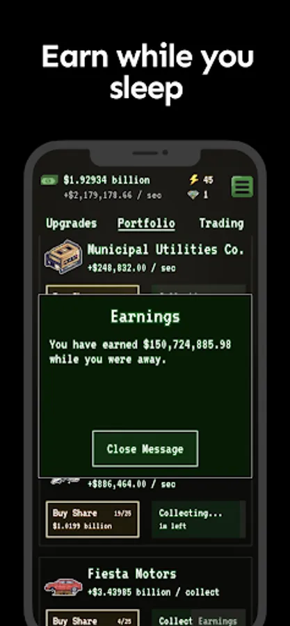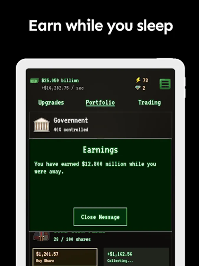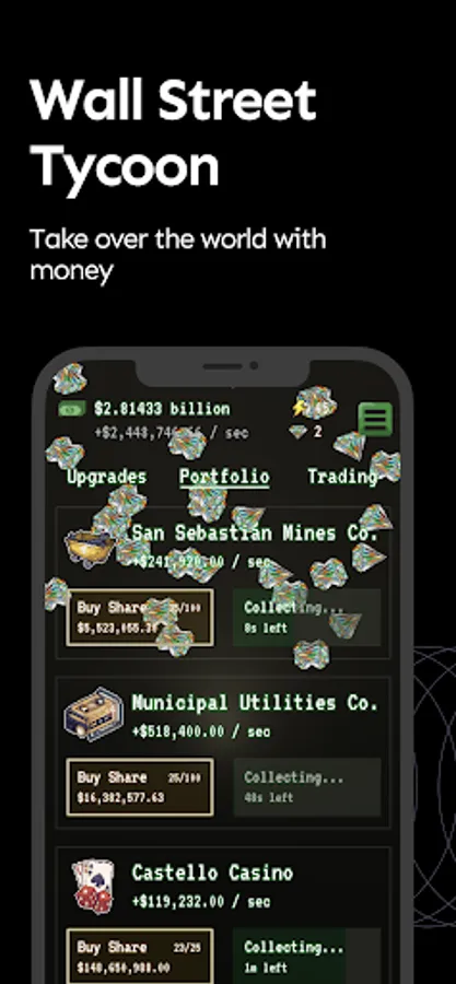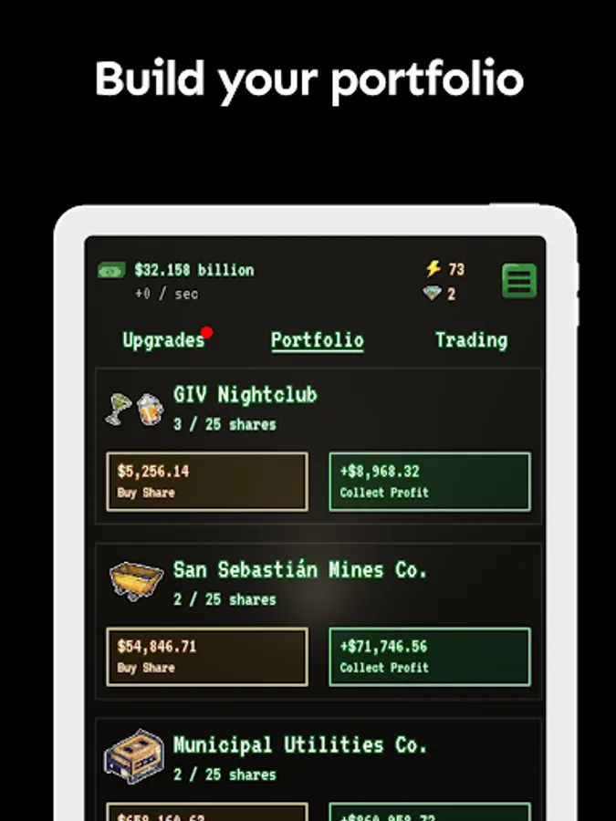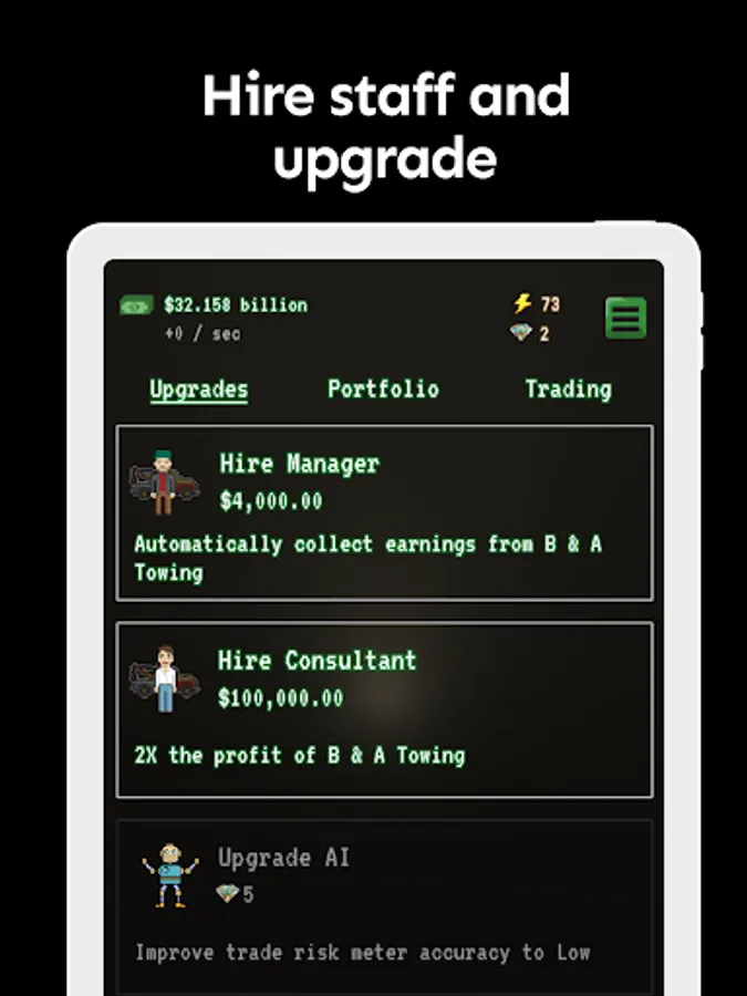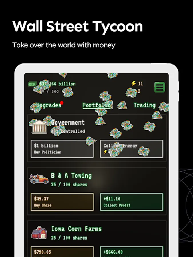 Start out with a single share of the local towing company. Collect profits and continue to buy shares in bigger businesses. As you grow your portfolio, hire managers and consultants to optimize businesses and earn more money faster.