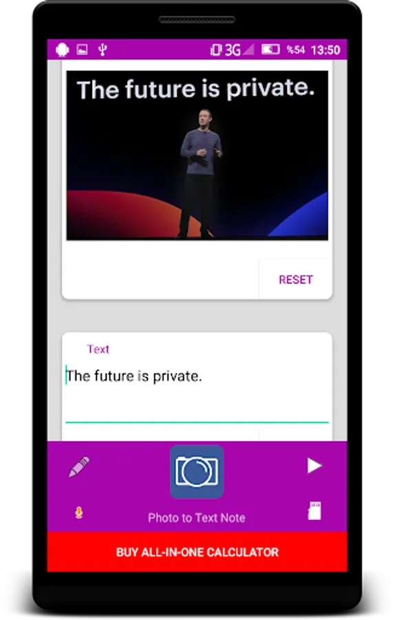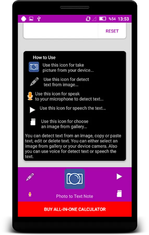 You can easily detect texts via take photo with your mobile device's camera, voice, screenshots or any kind of images. Also edit your text, copy - paste it, or delete. This free app is not 100% accurate right now but it is acceptable now.
