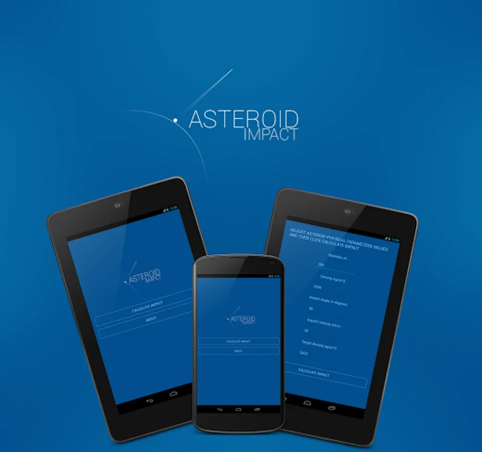ASTEROID IMPACT an easy-to-use app, will estimate if the asteroid hit the Earth, asteroid energy, mass, break-up altitude and frequency, asteroid energy, velocity and diameter near surface and crater type, diameter and depth.