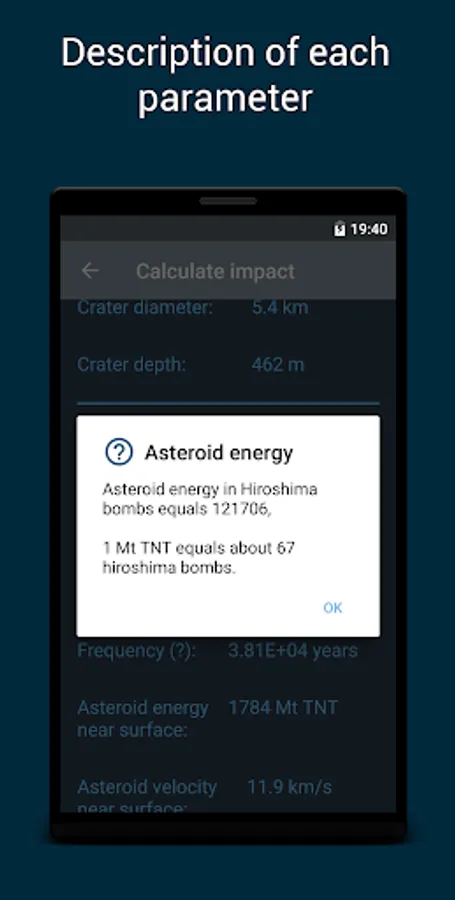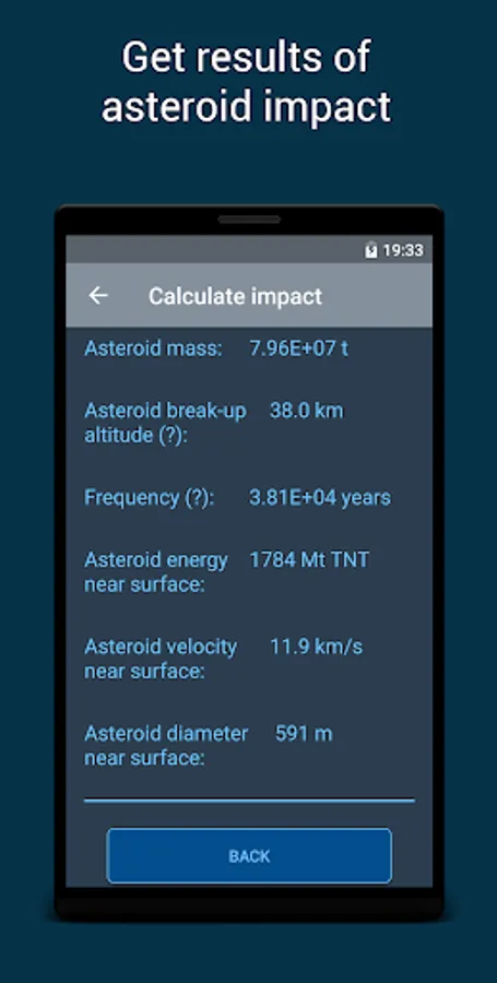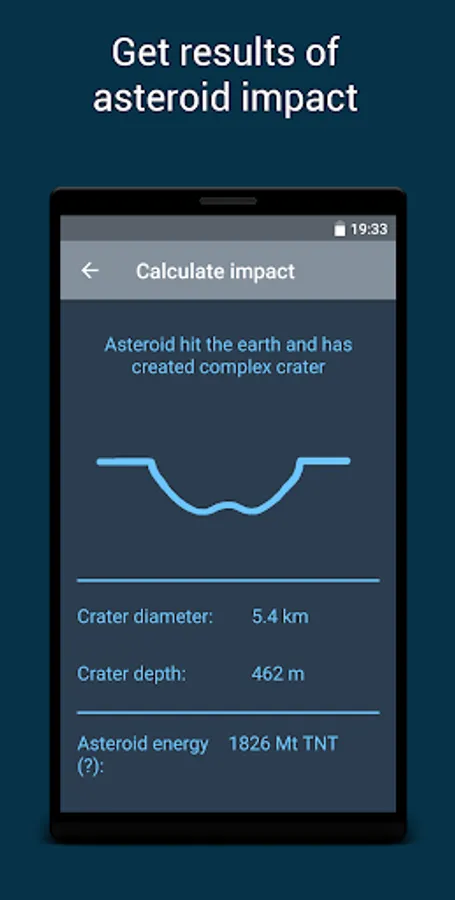 ASTEROID IMPACT 2 calculates asteroid energy, mass, break-up altitude and frequency, asteroid energy, velocity and diameter near surface, if the asteroid hit the Earth and crater's type, diameter and depth.
