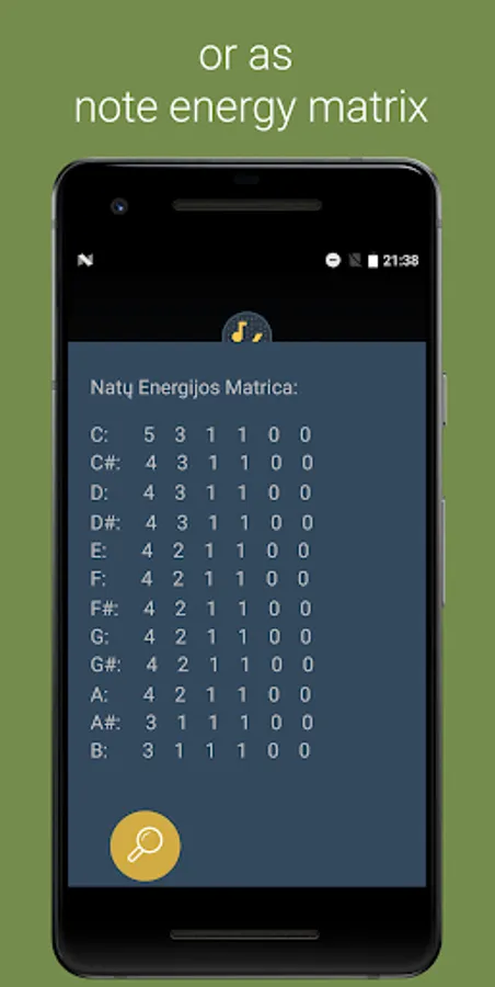 NEMa - sound note/pitch matrix. App records sound (20sec) and calculate recorded sound spectrum. Results are shown as note/pitch matrix and chart.