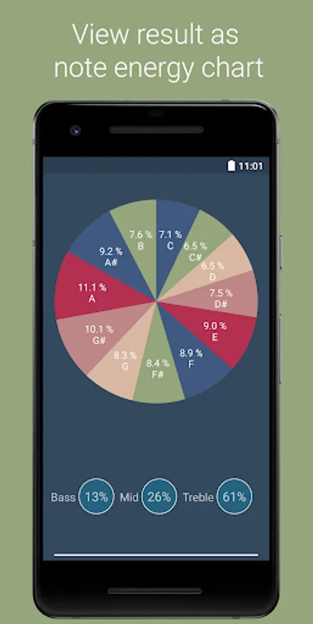 3) Press Chart button to show note pitch chart and percentage of bass, mid, treble in the recorded sound.