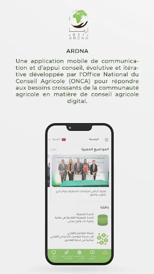 ARDNA est une application mobile de communication et d'appui conseil, évolutive et itérative développée par l'Office National du Conseil Agricole (ONCA) pour répondre aux besoins croissants de la communauté agricole en matière de conseil agricole
