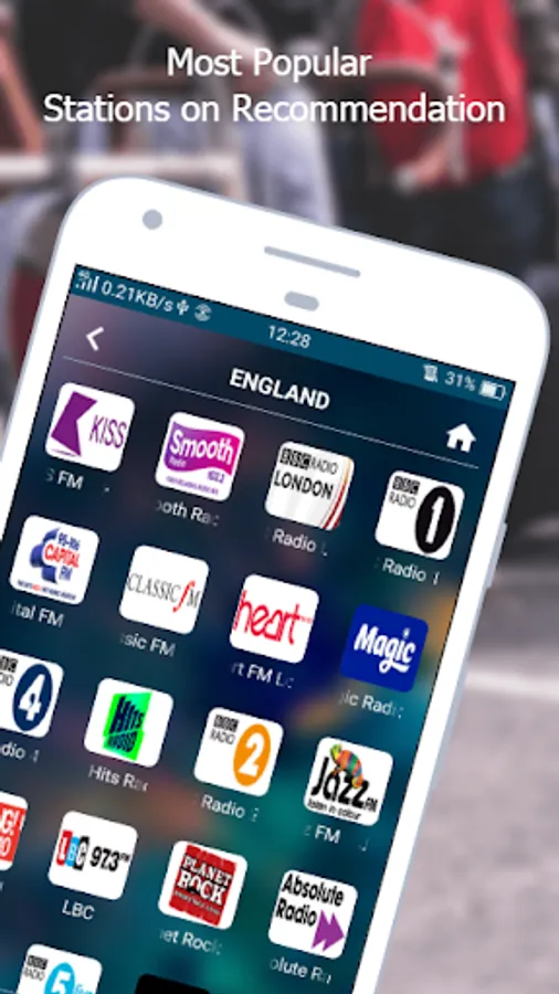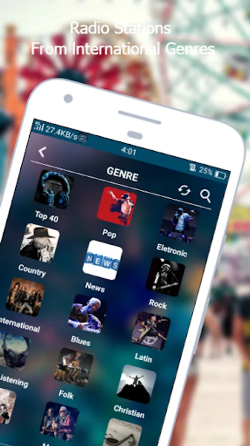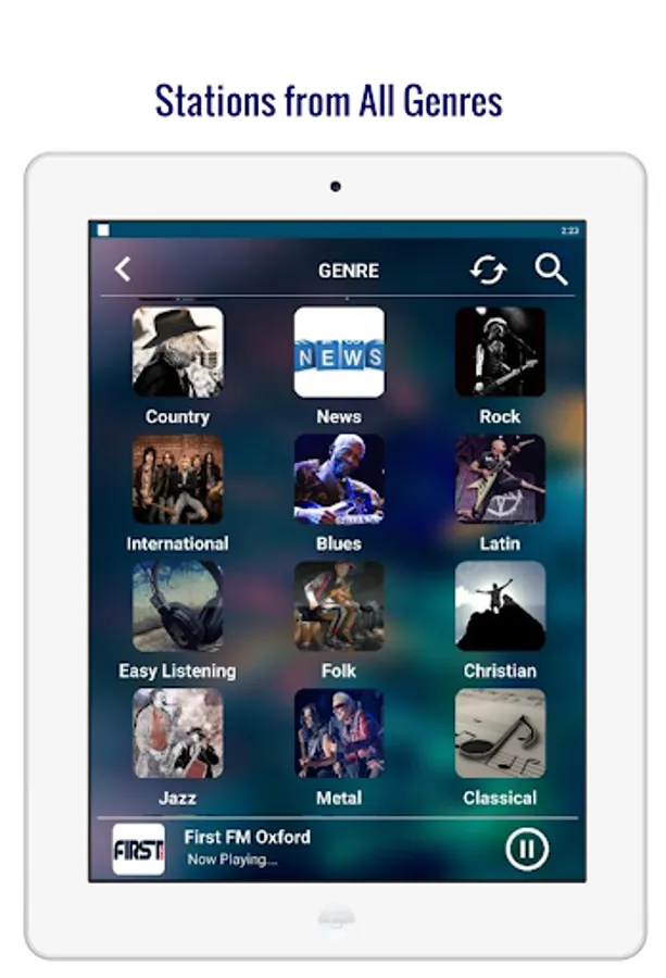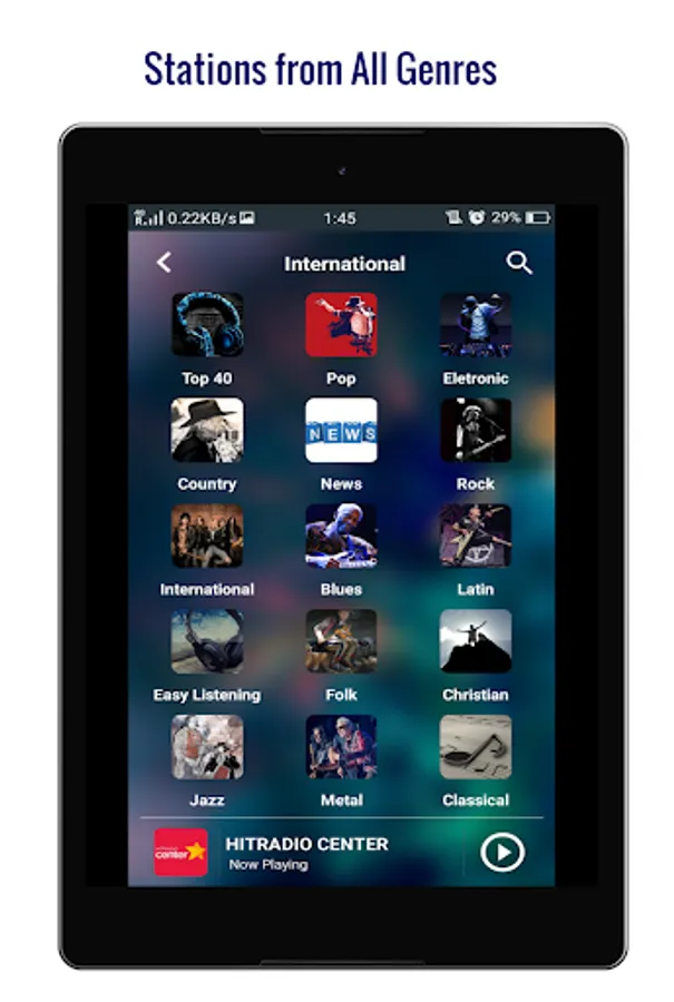 Pop, Rock, Electronic, Country, News, Hard Rock,Punk Rock, Blues, Metal, Hard Metal, Latin, Folk, Jazz, Classical, International, Rap, Reggae, Hip hop, R'n'B, New Age, Alternative, Top 40, Christan, News, Talk, Easy listening and etc