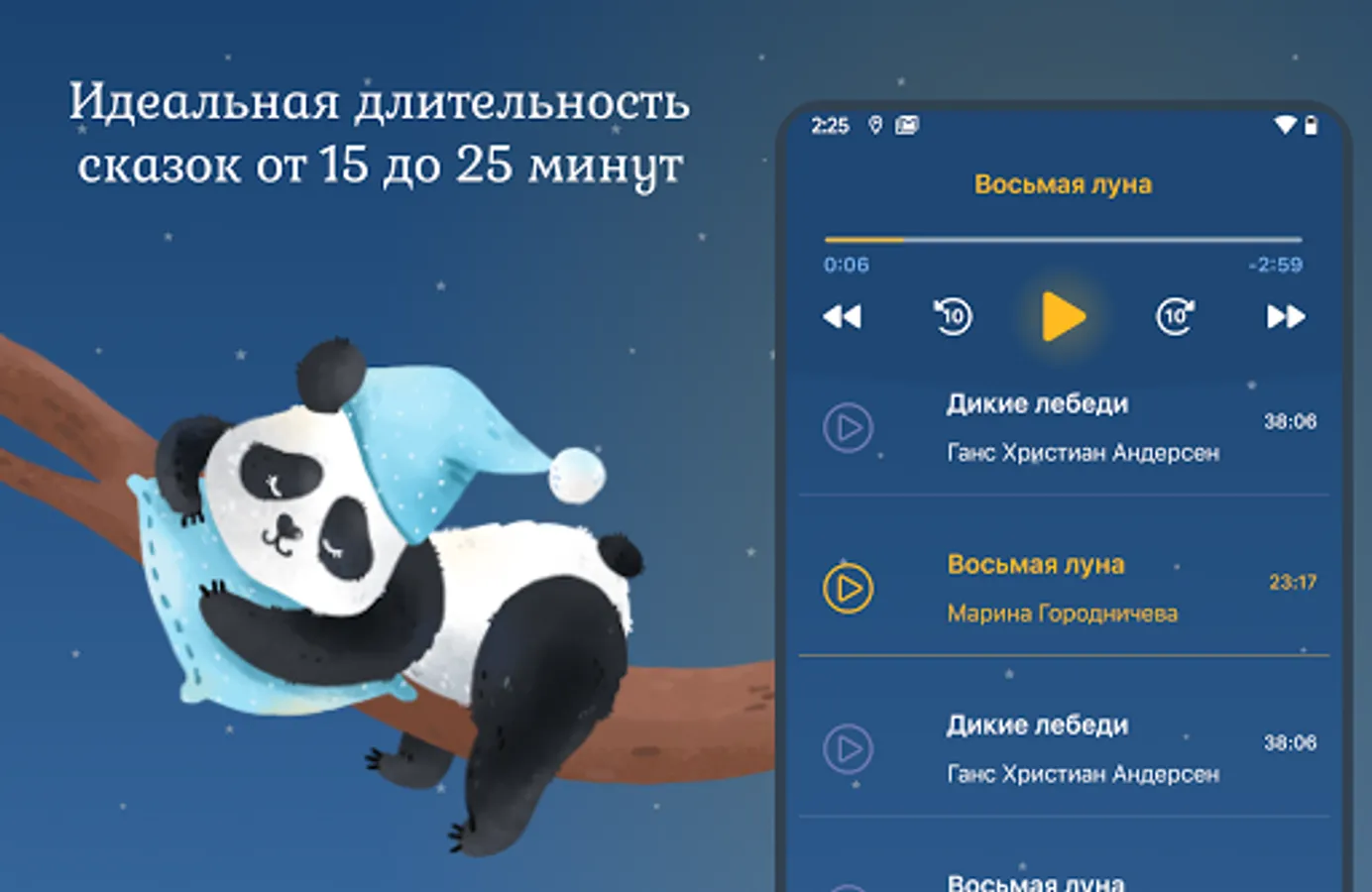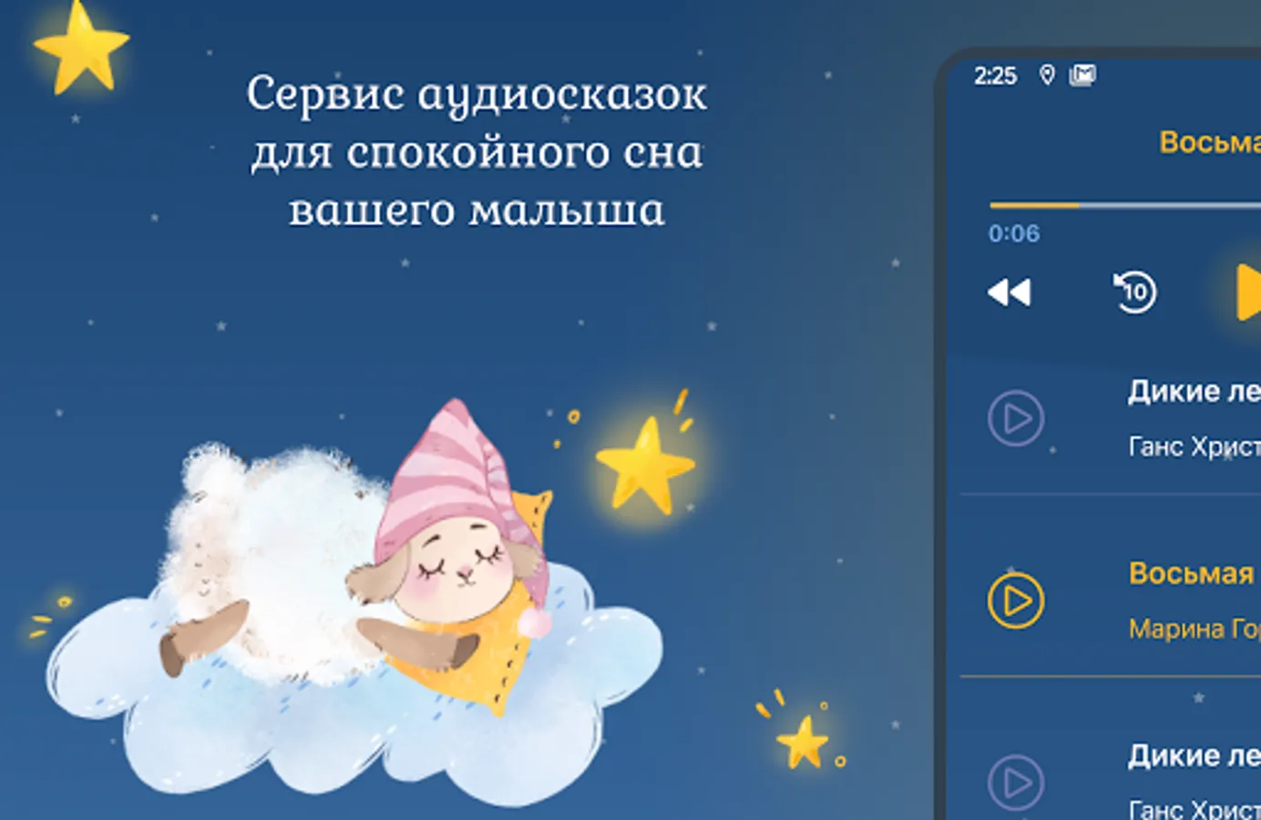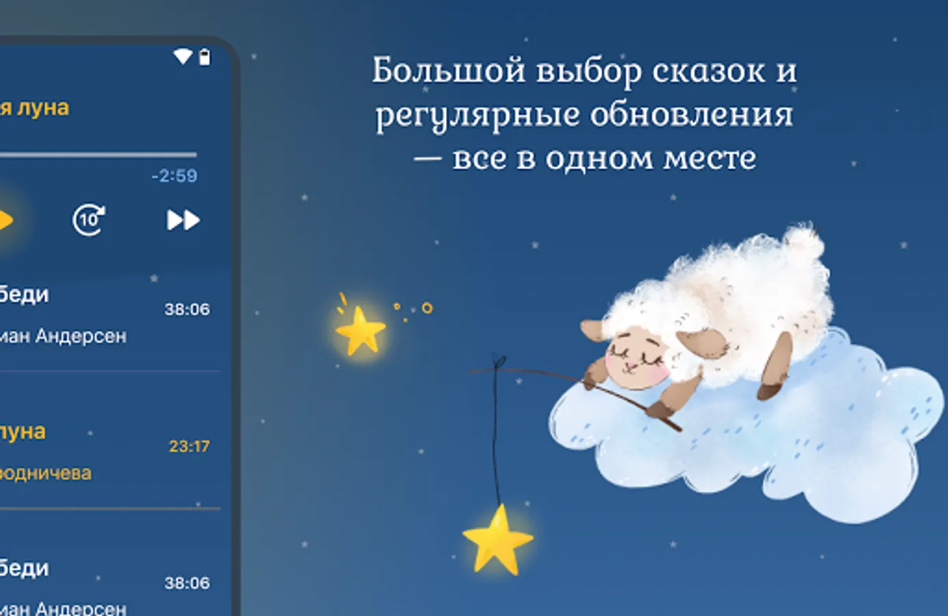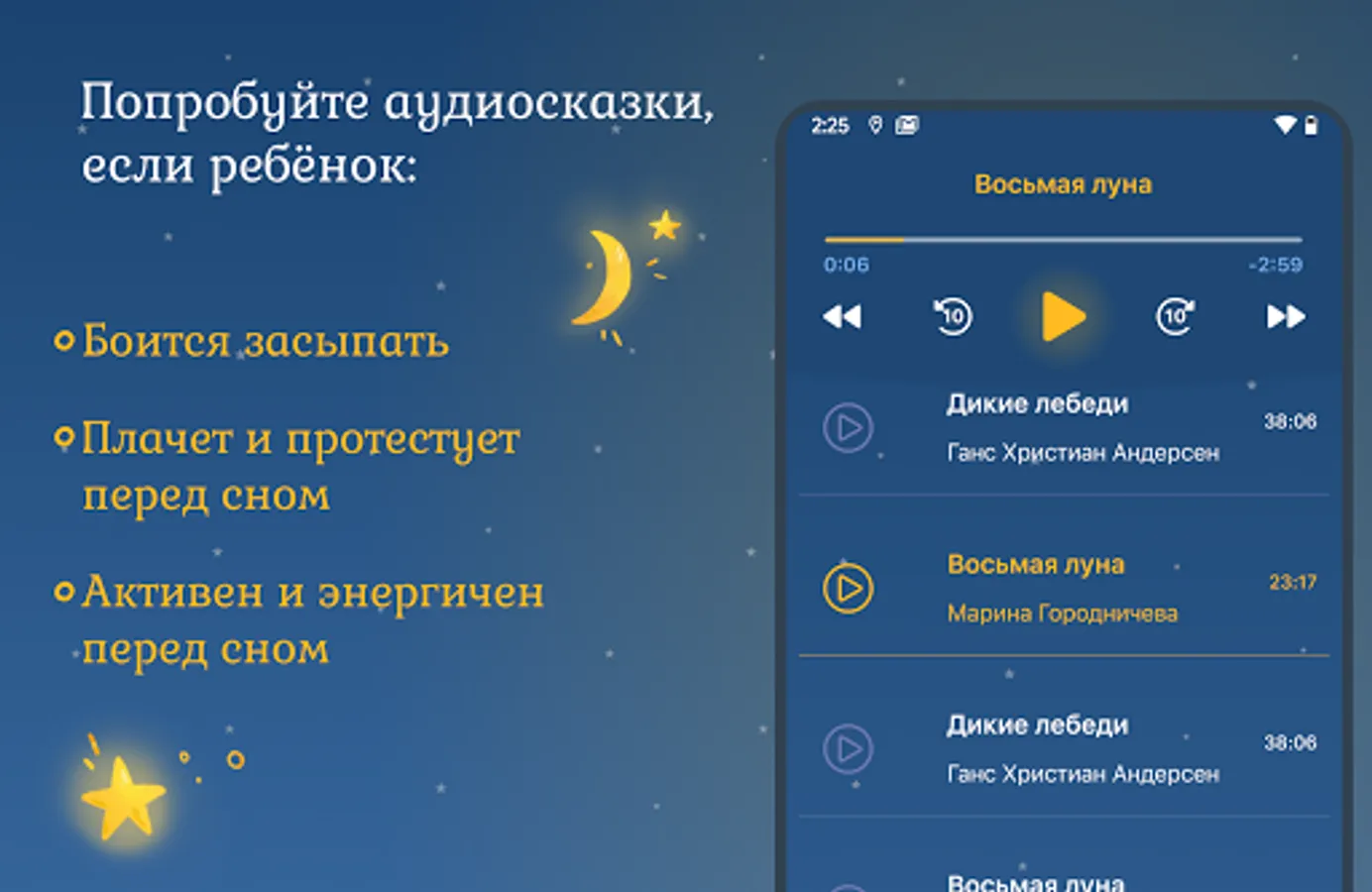 The calm, sleep-inducing pace of fairy tales will help create a sleep-inducing atmosphere. A large selection of fairy tales from classic to original and regular updates - all in one place. No ads or abrupt sound transitions, all the best for your child.