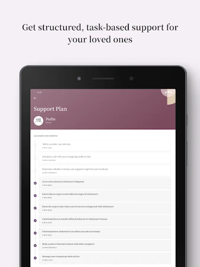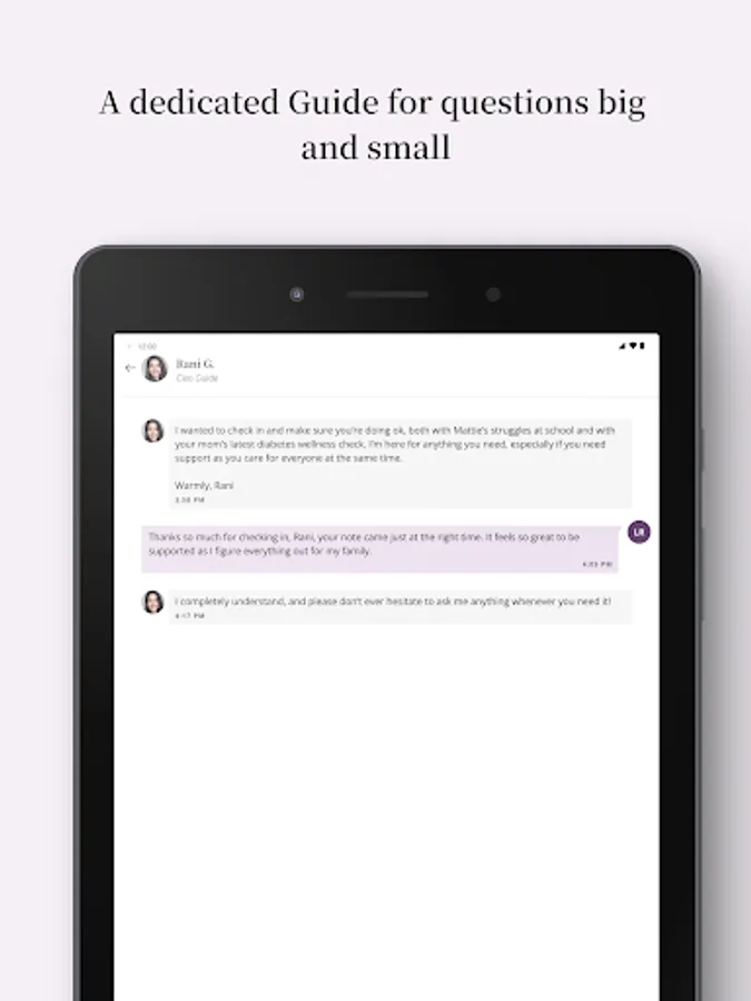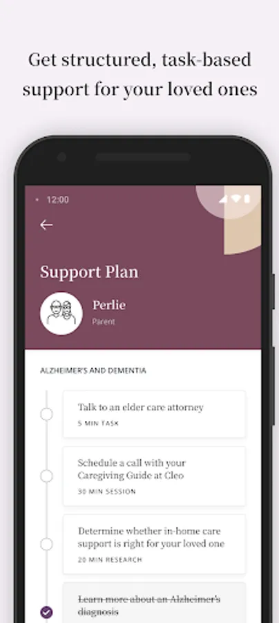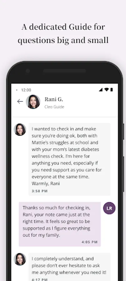 One-on-one expert support. Upon signing up, you will be paired with a Cleo Guide, a trained and certified expert (a real human!), ready to answer your questions and support you through the ups and downs of parenting and caregiving. You can message your Guide at any time and schedule live sessions with them to discuss any caregiving topics or issues you may be facing.