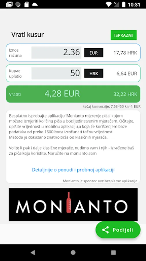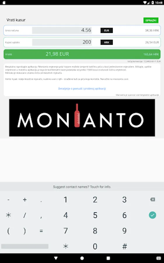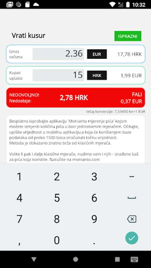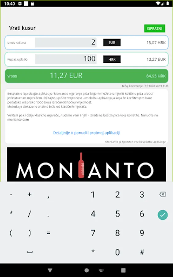 In the first two weeks of 2023, it is possible to pay in kunas and the change is in euros. To make it easier for you to calculate, enter how much you need to pay and how much kuna the buyer gave, and you will get a refund in EUR (or kuna if you don't have enough).