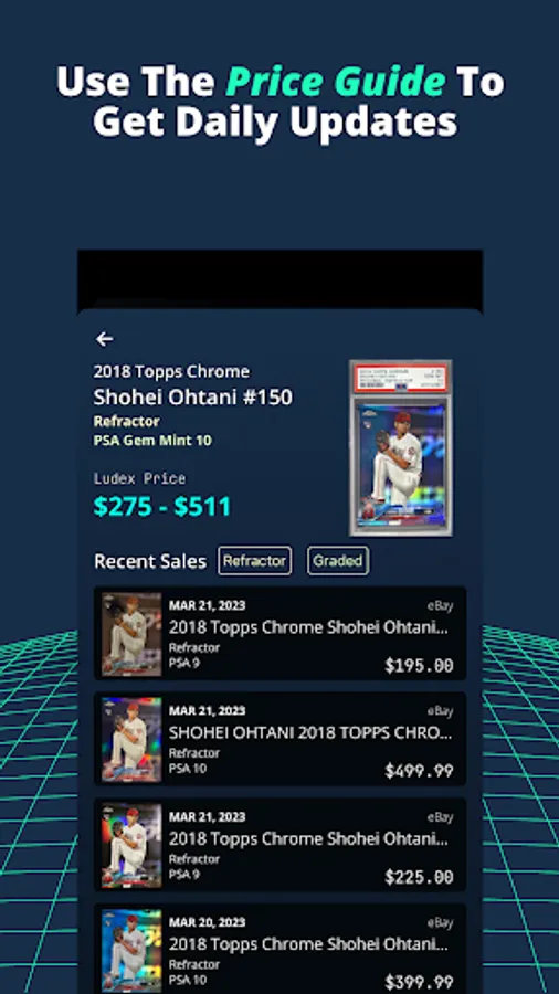 Our proprietary algorithm includes sales data from all major trading card and sports card marketplaces. Lite and Standard members can see filtered and updated daily sales data with Price Reports.