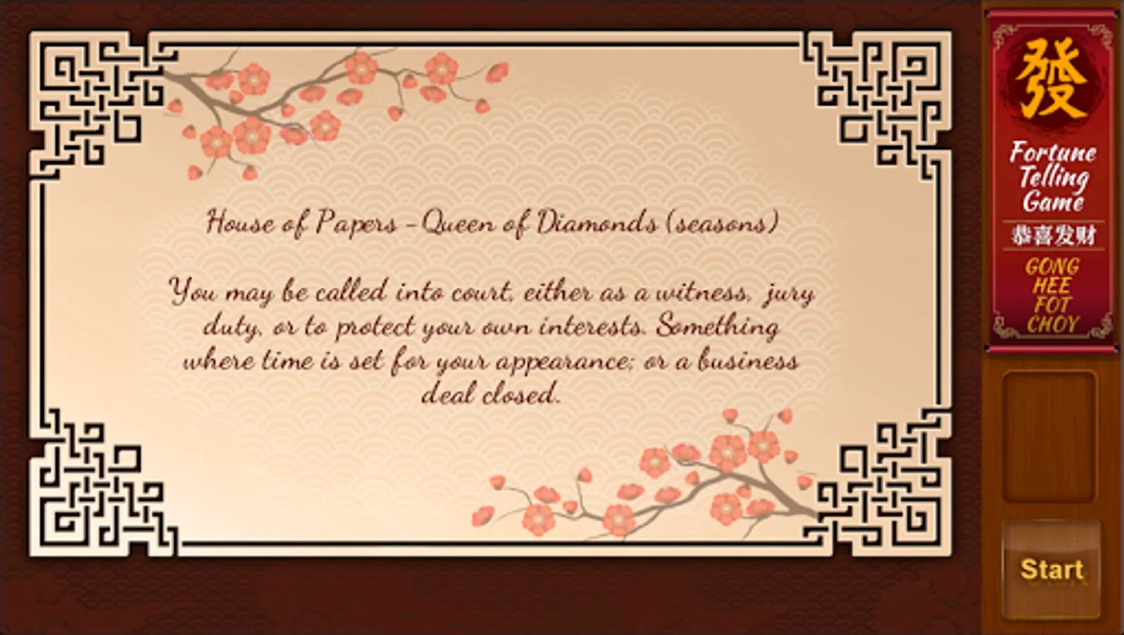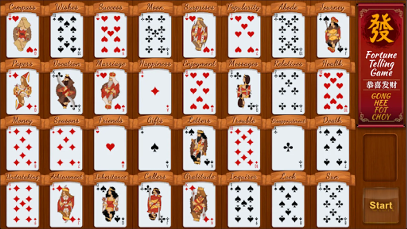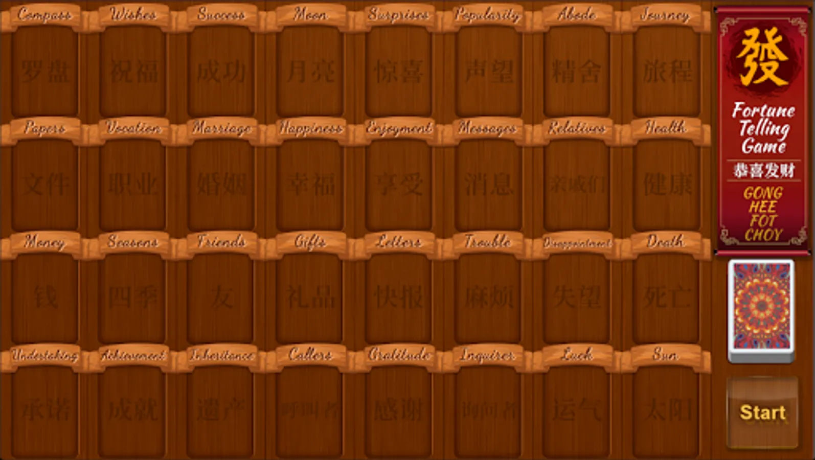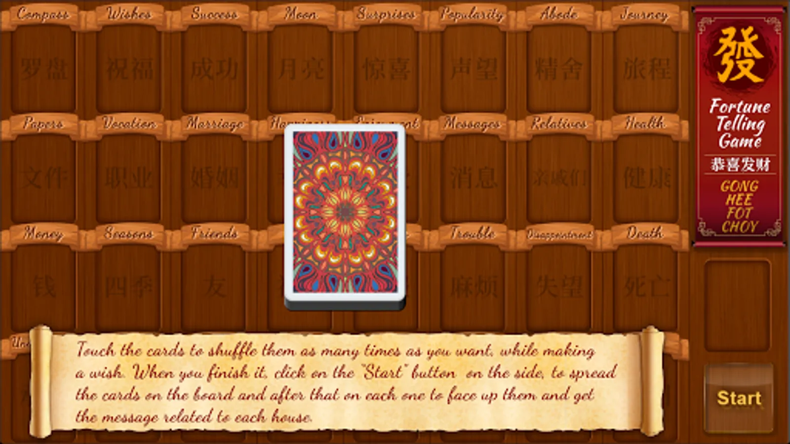 Find out what the fate reserves for you, playing this fortune-telling game based on "The Greetings of Riches" (Gong Hee Fot Choy), a system of divination developed by the famous mystic and traveler Margaret Ward in the 30's.