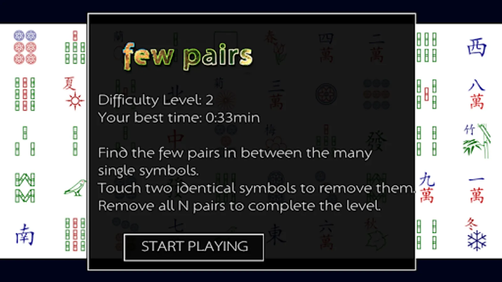 9 playmodes free: OPEN PAIRS, LAYERED, ROTATED, HIDDEN, FEW, PUZZLE, CHAINS, SLIDING MATCH-3 and Mahjong variation SHISEN SHO. 4 more: MAZE, DIFFERENCE, DROP, SETS.