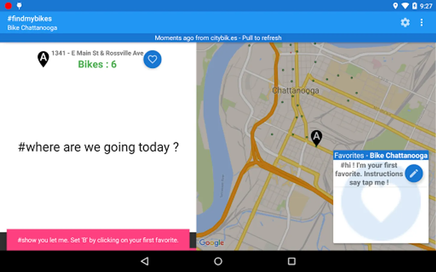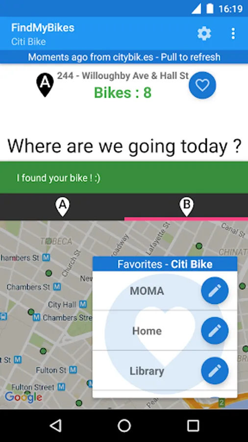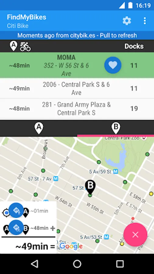- the location of the most optimal free dock at destination (especially useful in times of affluence : #findmybikes does't simply show you the nearest dock to your destination, but smartly minimize your total trip time, including walking)