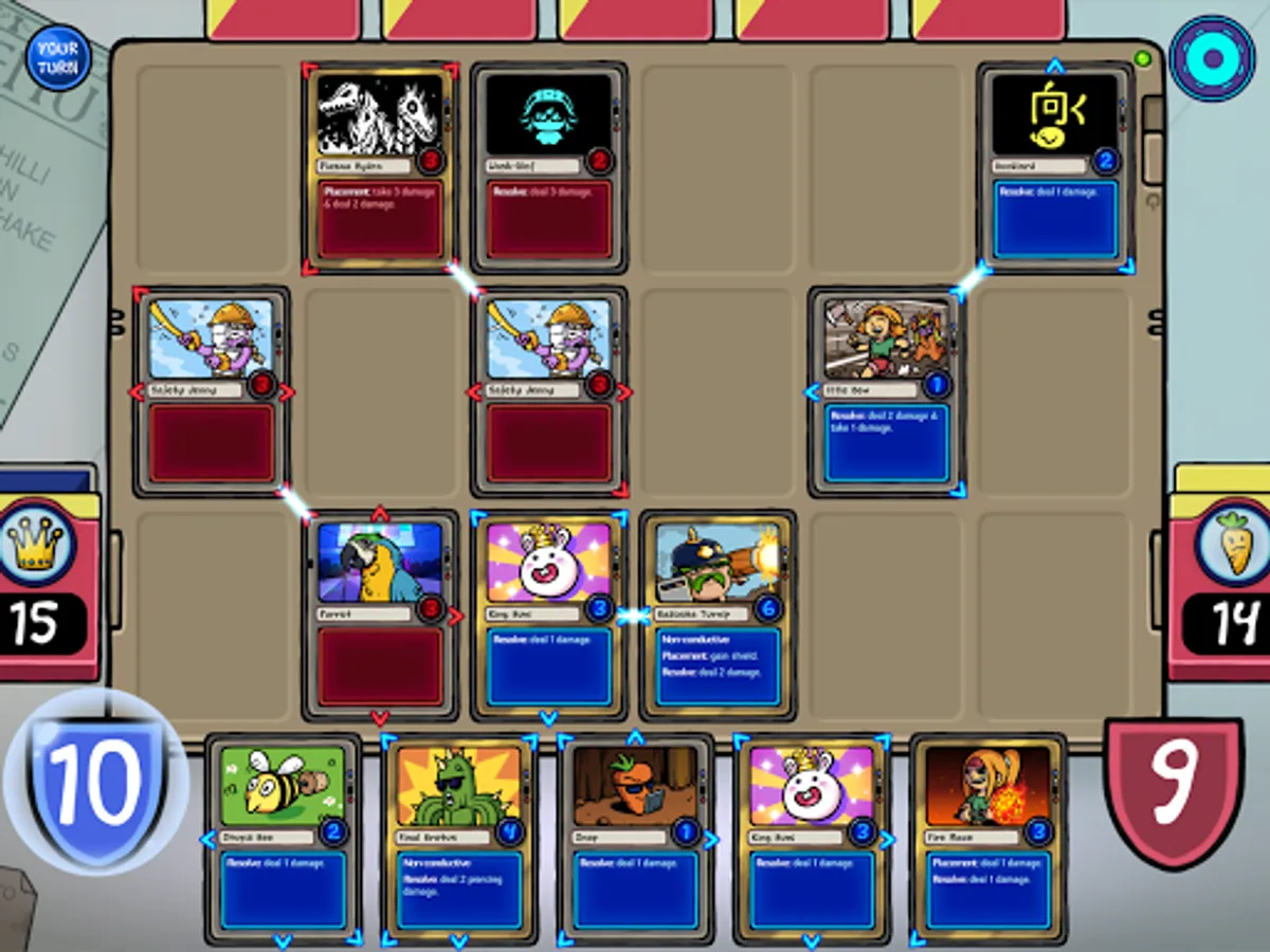 The Card Game (or TCG for short, the only card game they play in space) is played by two players on a single board. Connect your cards to give them power, and when they're all fired up they deal damage, heal, shield, or mess with your opponents cards. Since they stay on the board after they've been activated, you can keep combos alive indefinitely by stringing new cards into the chain. Playing on the same board gives you opportunity to further mess with you opponents, blocking their moves or stealing their power!