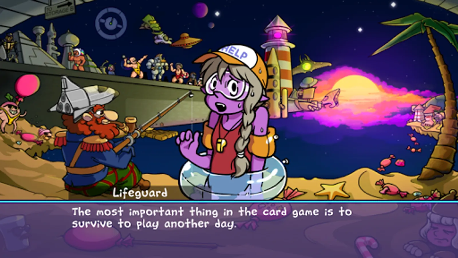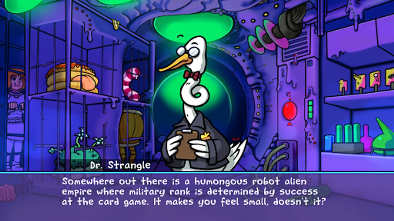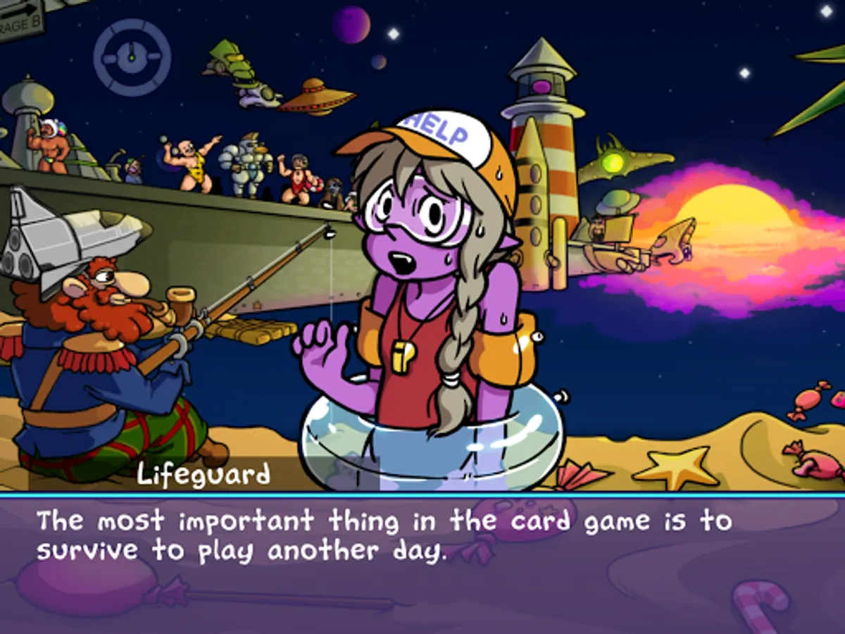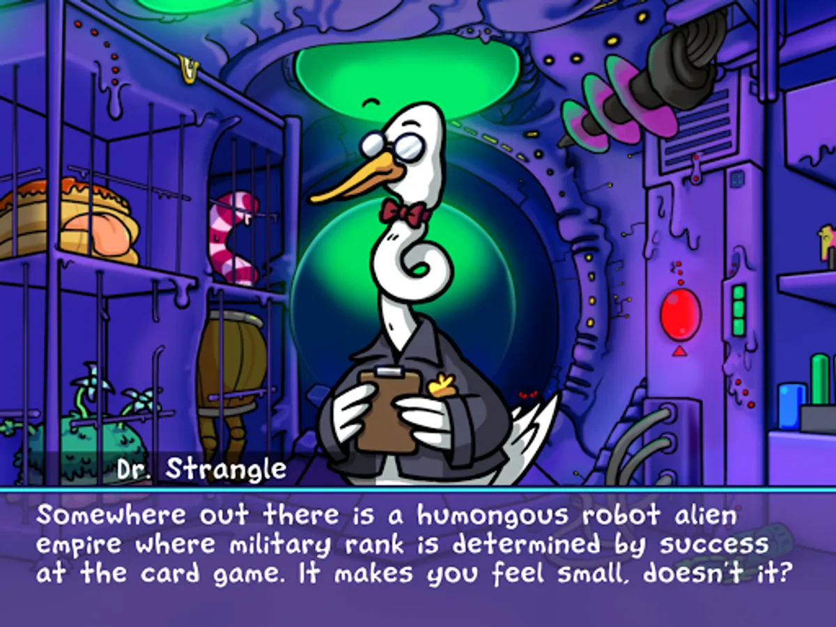 Journey through a mysterious flying city called Starship Frivolity where every inhabitant is obsessed with the latest space-craze, The Card Game! Battle them to win their trust - and their cards! - and progress through the dubious laboratories, haunted docks and lethal restaurants of this space station to find out its greatest mysteries.