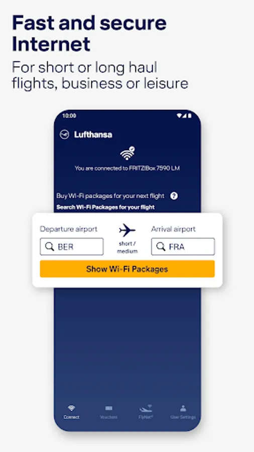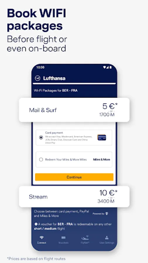 Board, take off and start surfing without delay: from now on you can choose and purchase the Internet access that suits your requirements for your upcoming flight via the app while you are still on the ground. The access is valid for the calendar year of the purchase and the three subsequent calendar years and can only be used once.
