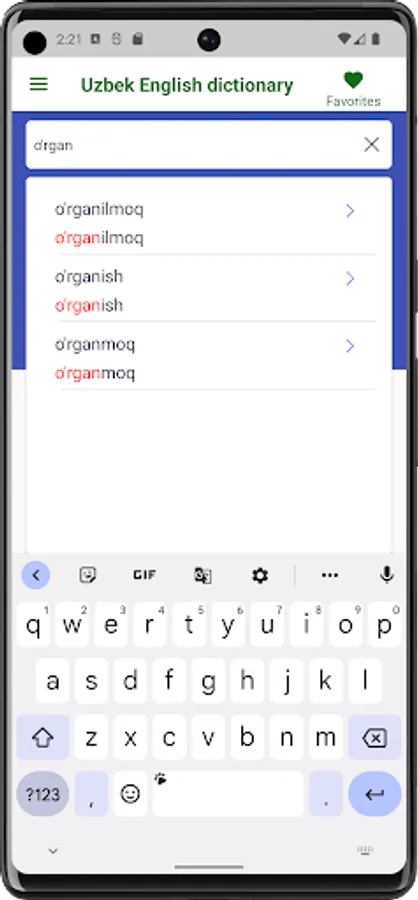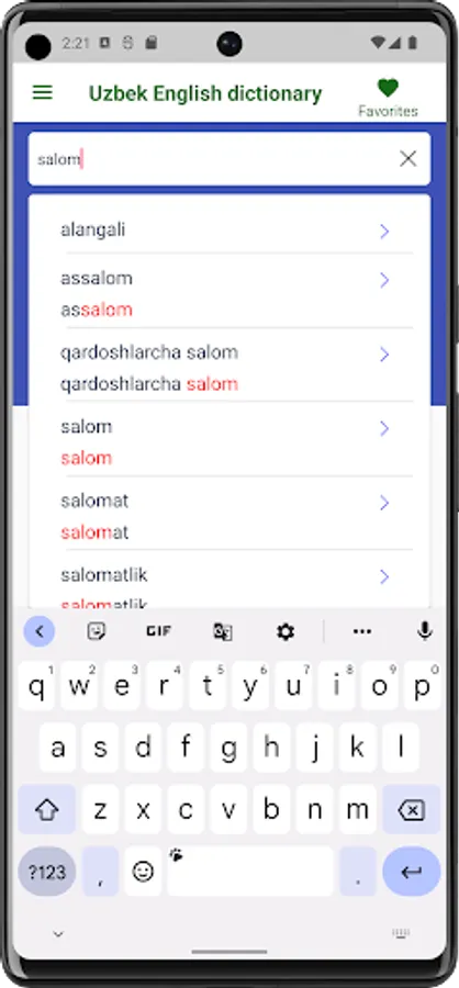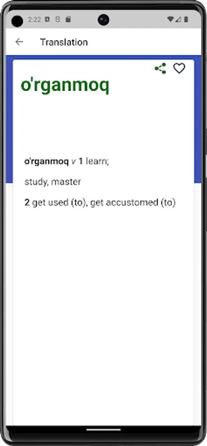 Lugat o’zbekcha so’zlarni inglizcha batafsil tarjimasini topishingizga yordan beradi. So’zlar tarjimasi bir nechta ma’nolarini keltiradi va qo’llanishiga oid misollar bilan tushuntiradi.