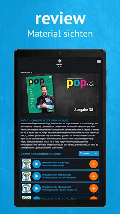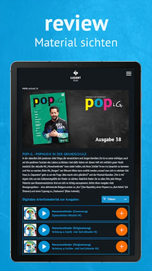 With the app, you can easily access the content of your subscribed magazines at any time, as well as compile playlists with audio samples, worksheets and videos for your music lessons and then use them in your lessons.