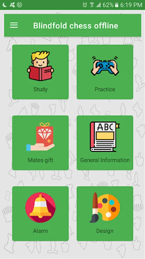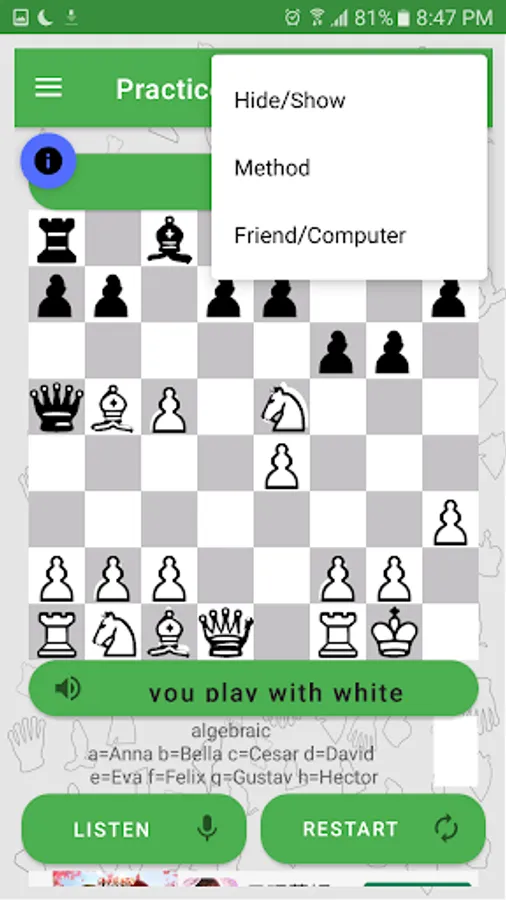 It includes a section to practice playing blindfold games against a friend(bluetooth) or against the computer, showing or hiding the board.