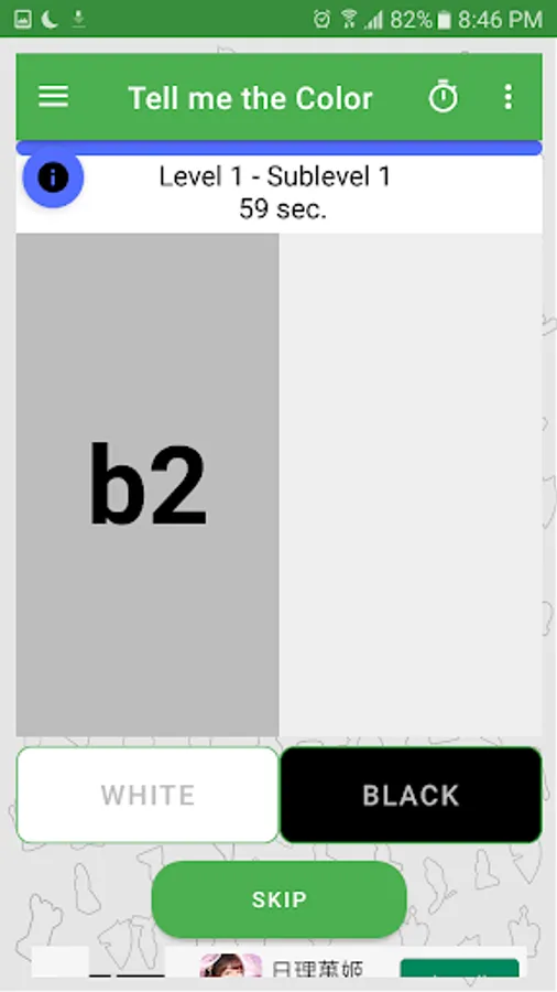 -Tell me the color of the cell: The application will show you a box and you must choose if the color of the box is white or black, this will help you memorize the color of the boxes.