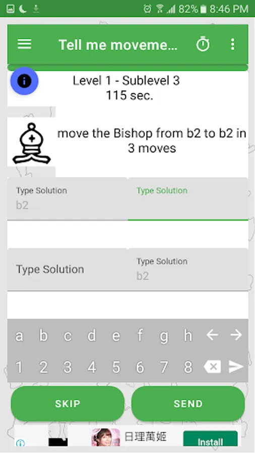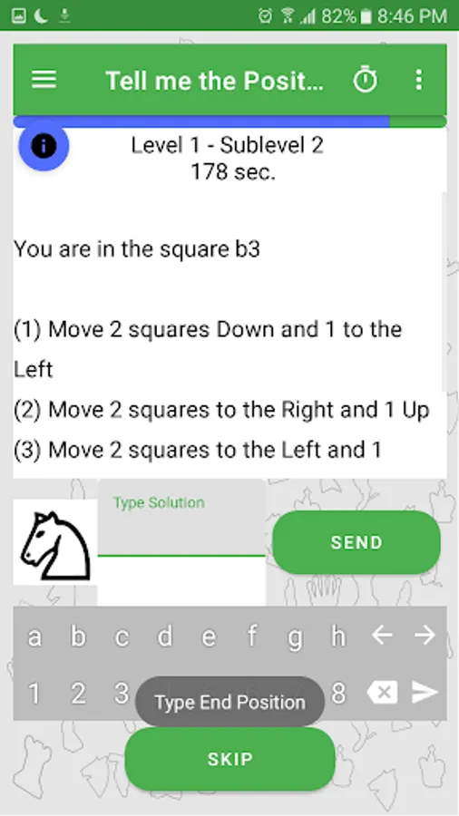 -Tell me movement: In this section it will show you a piece, an initial square, a final square and a number of movements, the idea is that you take the piece from the initial square to the final square in the indicated number of movements.