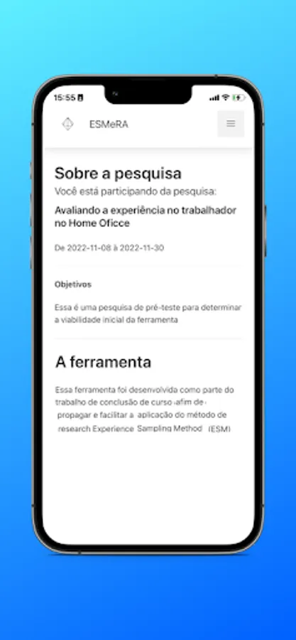 ESMeRA (Experience Sampling Method Research Application) is a tool that facilitates the implementation of the Experience Sampling Method research method. Focused on helping researchers understand the real experience of the individuals studied as these experiences occur