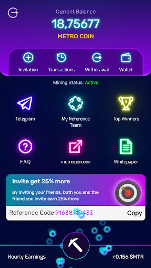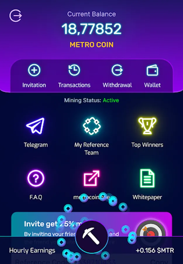 Users have a chance to earn more coins by inviting their friends while mining. Balances earned through Metro Network offer the opportunity to shop for goods, services and real life.