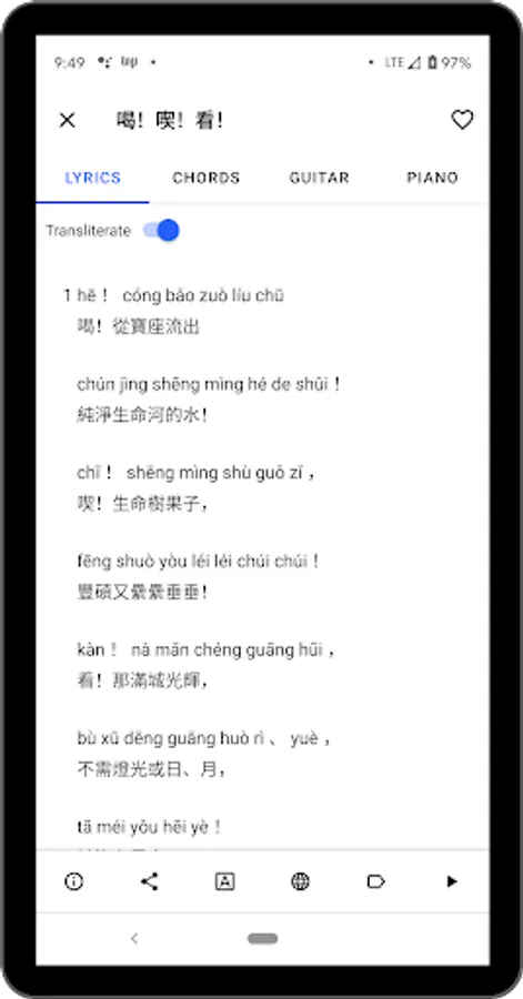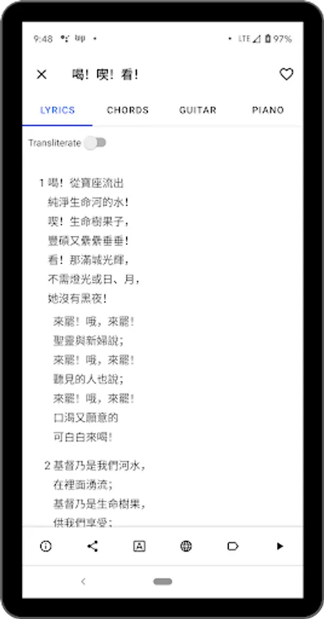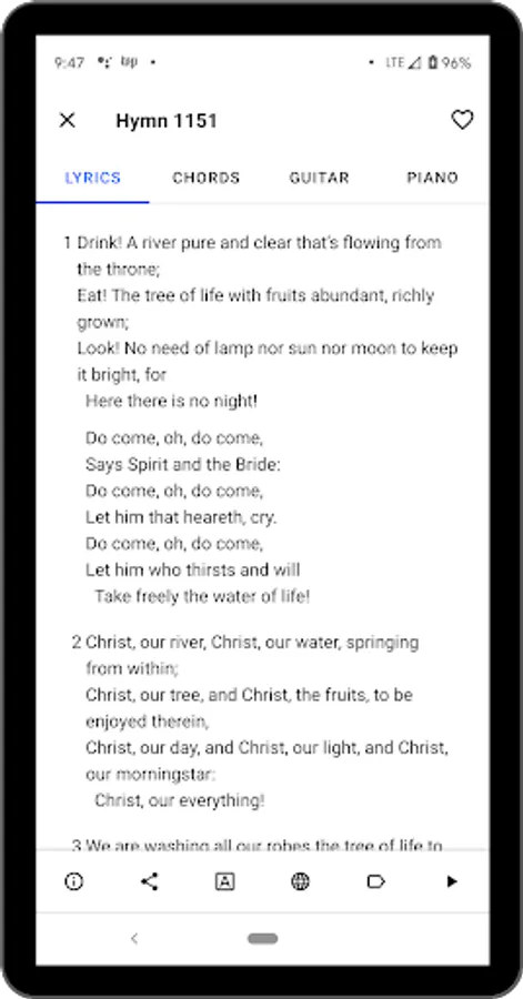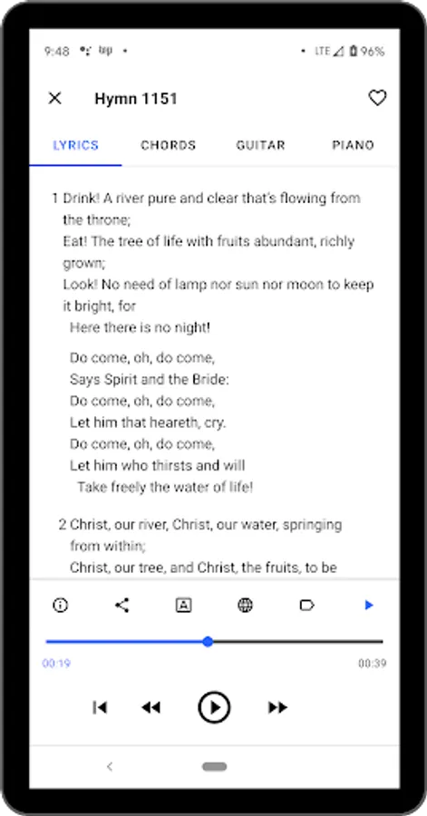 - Play hymn instrumentals with pop-up music player controls (requires network connection).