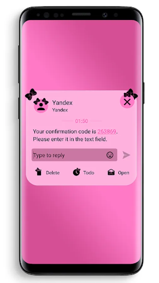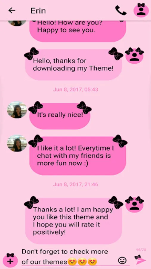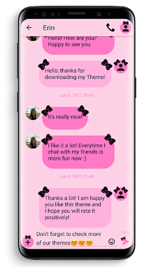 ❤️ Black Ribbons and Bows are so cute and adorable and they perfectly decorate the lovely pastel pink and fuchsia wallpaper and chat boxes! This cute pink SMS Theme will make messaging and chatting a lovely experience. Customize the way you send and receive text messages and SMS to show your personal look and style!