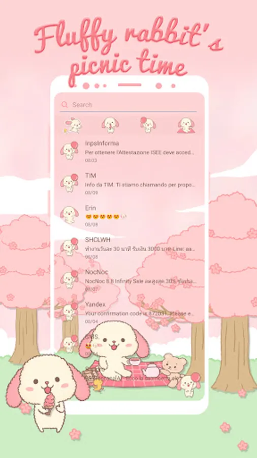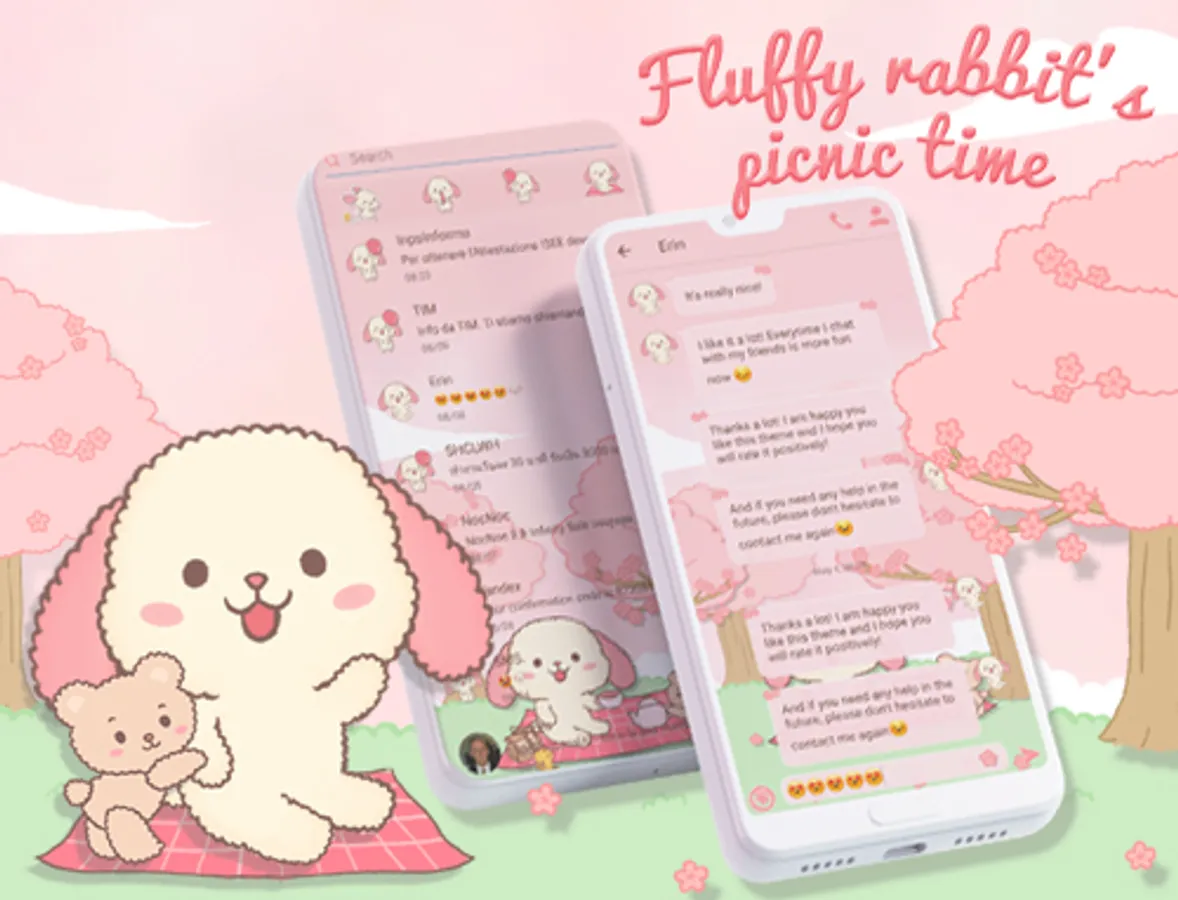 Download "SMS Theme Rabbit Sakura - Pink Picnic" theme and you will have a brand new Android popular phone style in 2021! This sakura cherry theme will give your messaging app a cute picnic rabbit wallpaper and design!