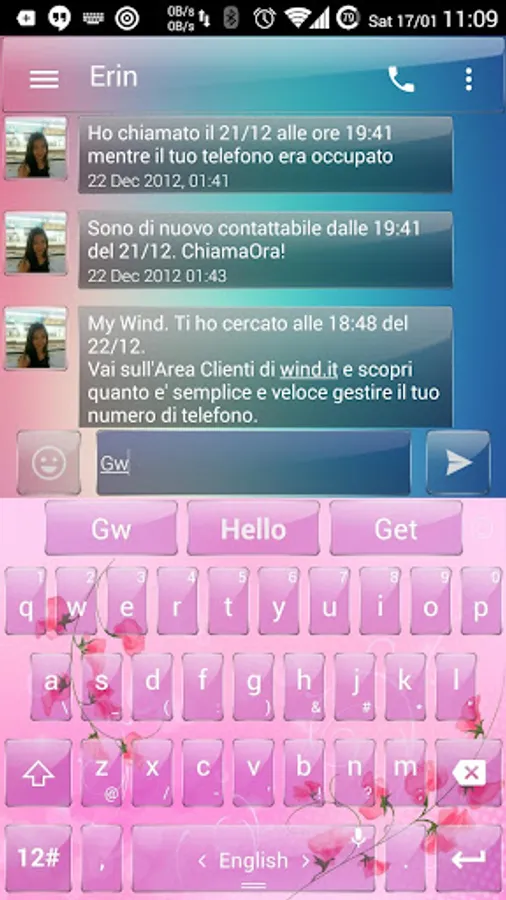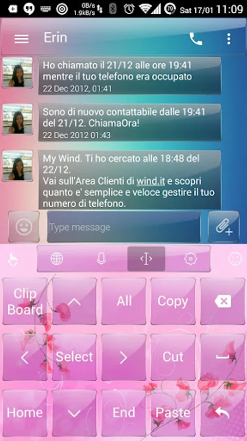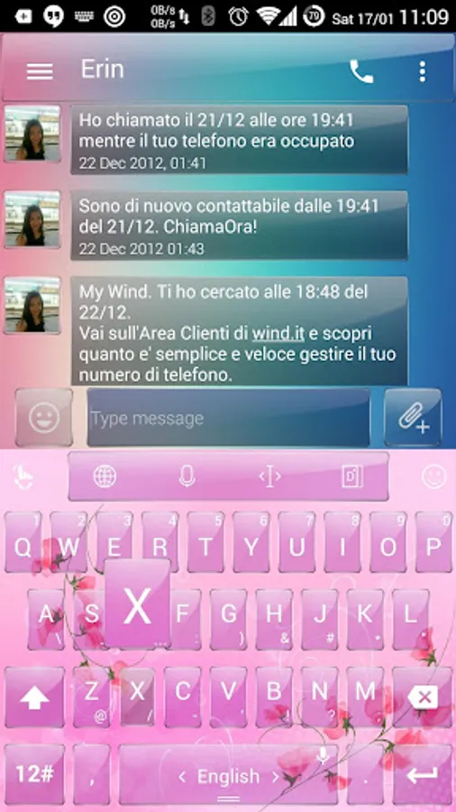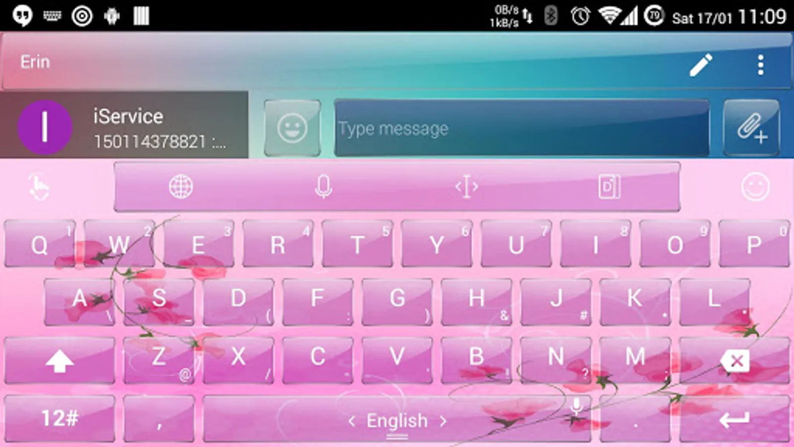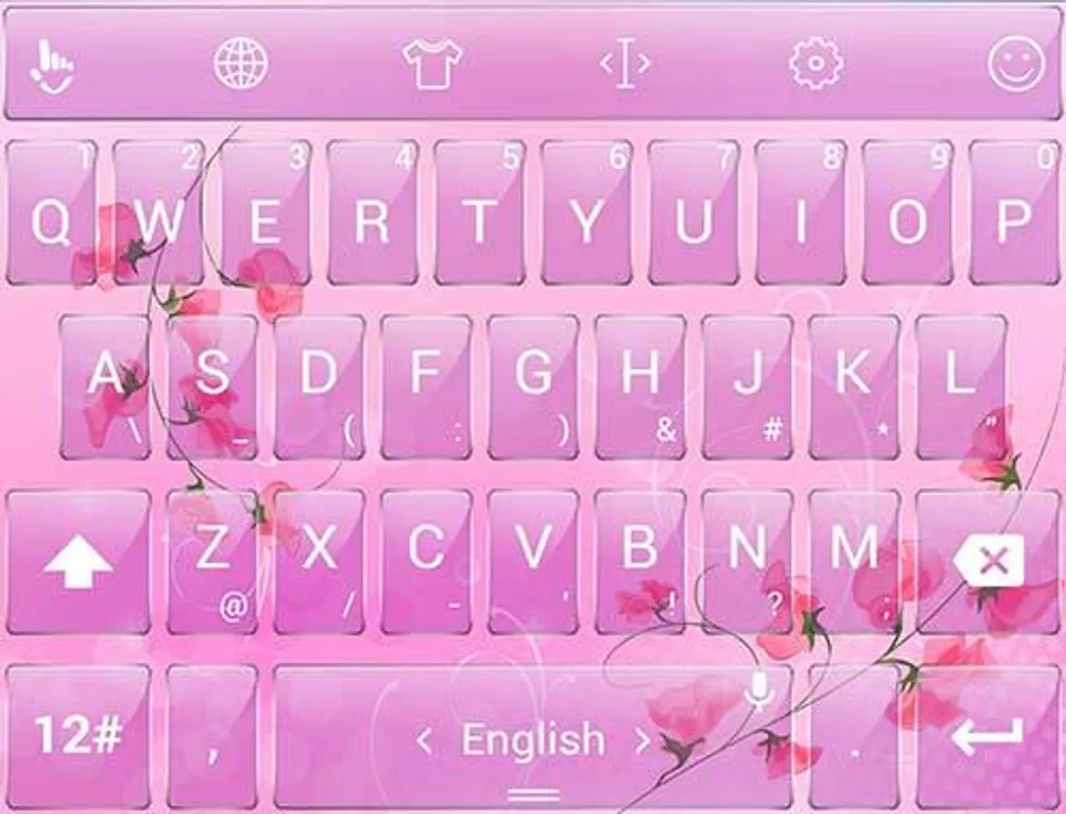 This is a TouchPal theme with glass transparent keys over shades of pink and flowers background for TouchPal Keyboard application.