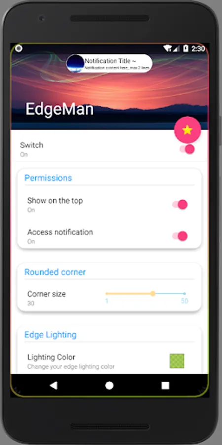 ☆ No mater what you are doing, when your important notification coming, you will see a cool color mixed circle lighting around your phone edge, and you will see a brief of the notification by a customized heads up notification.
