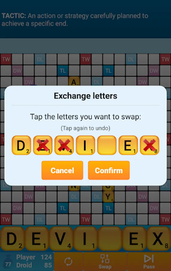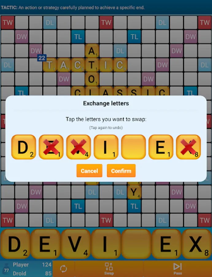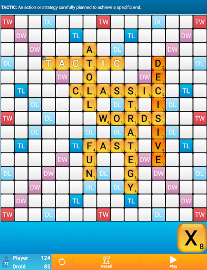Choose the skill level of the computer (from beginner to expert), pick a word list (English word lists include the latest NASPA Word List 2020), and use your strategy skills and vocabulary to try and defeat the Droid.