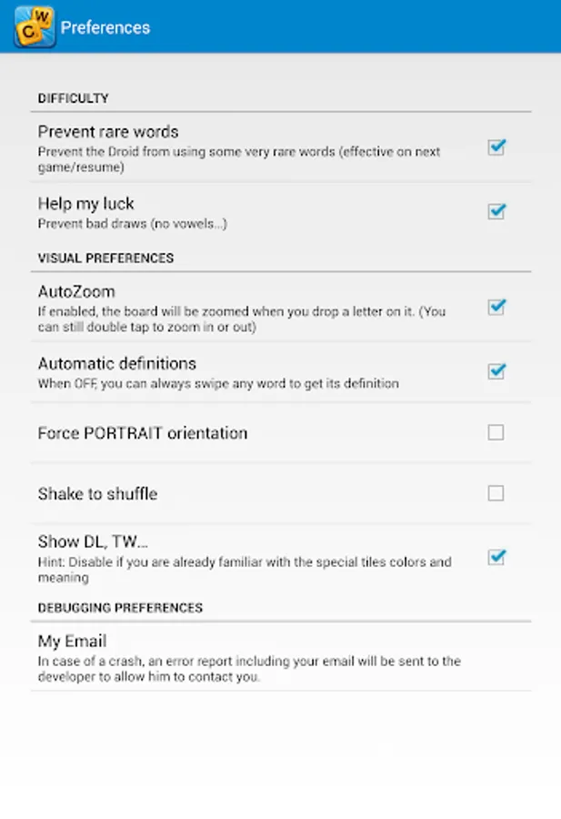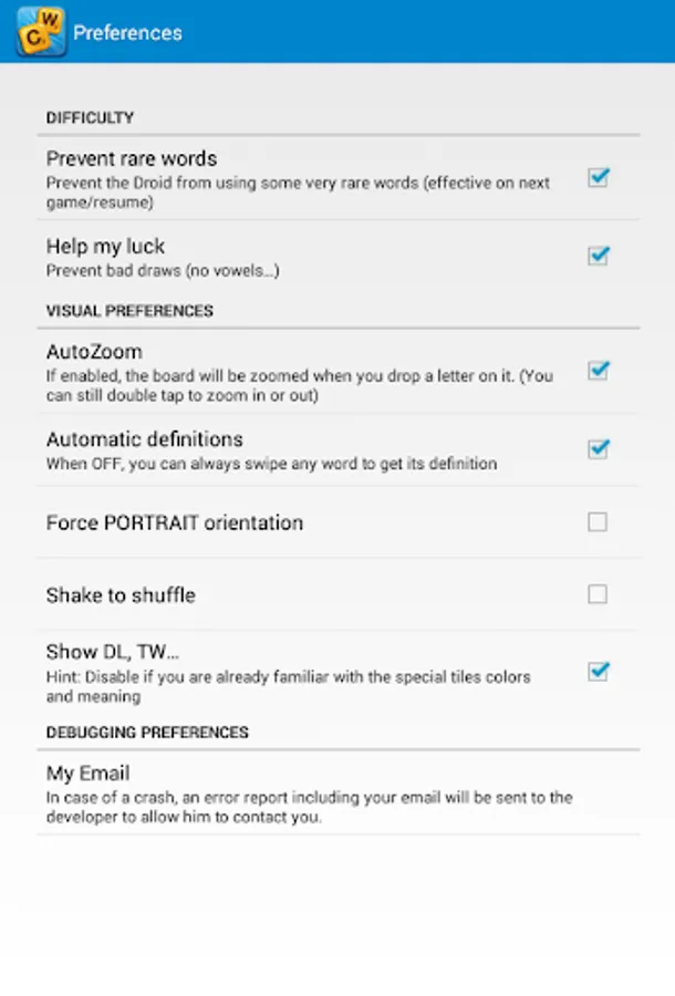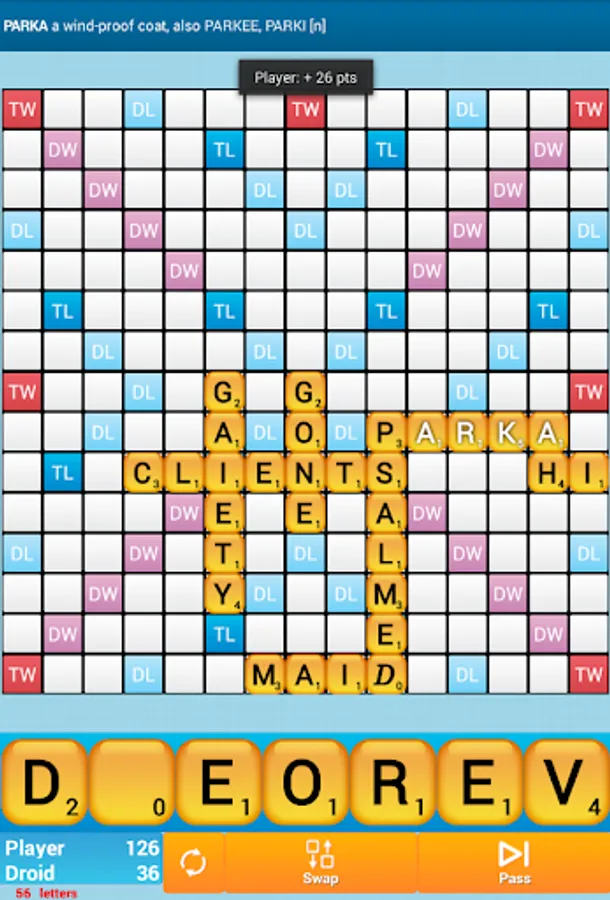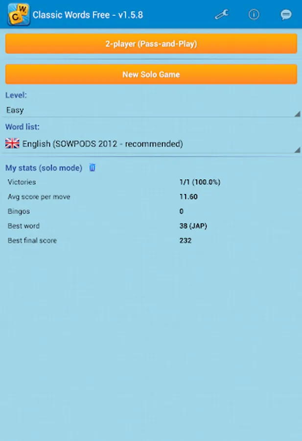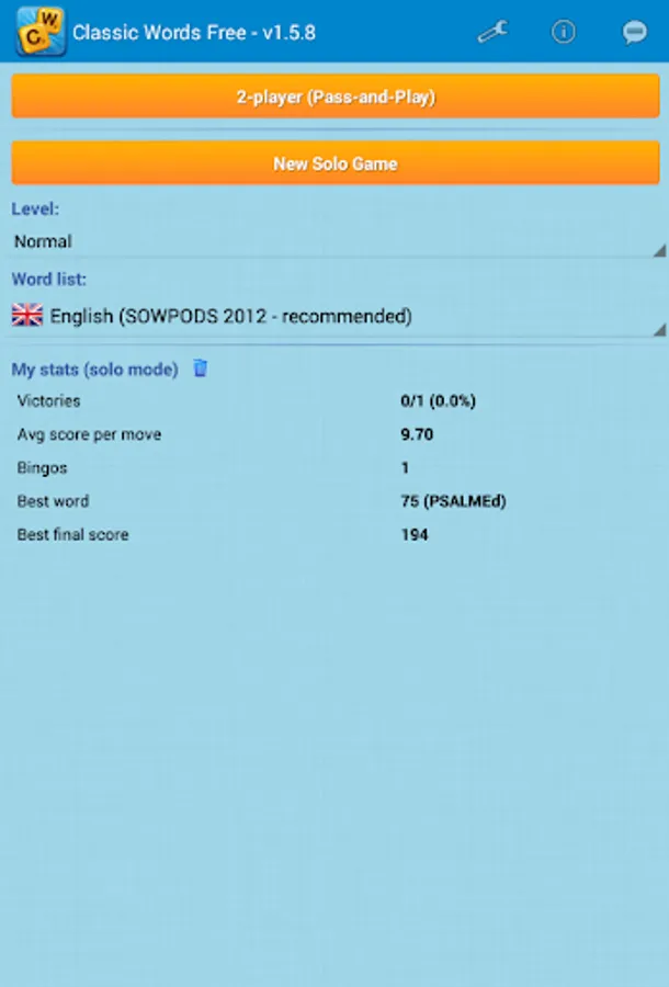 Choose the skill level of the computer (from beginner to expert), pick a word list (English word lists include the latest NASPA Word List 2020), and use your strategy skills and vocabulary to try and defeat the Droid.