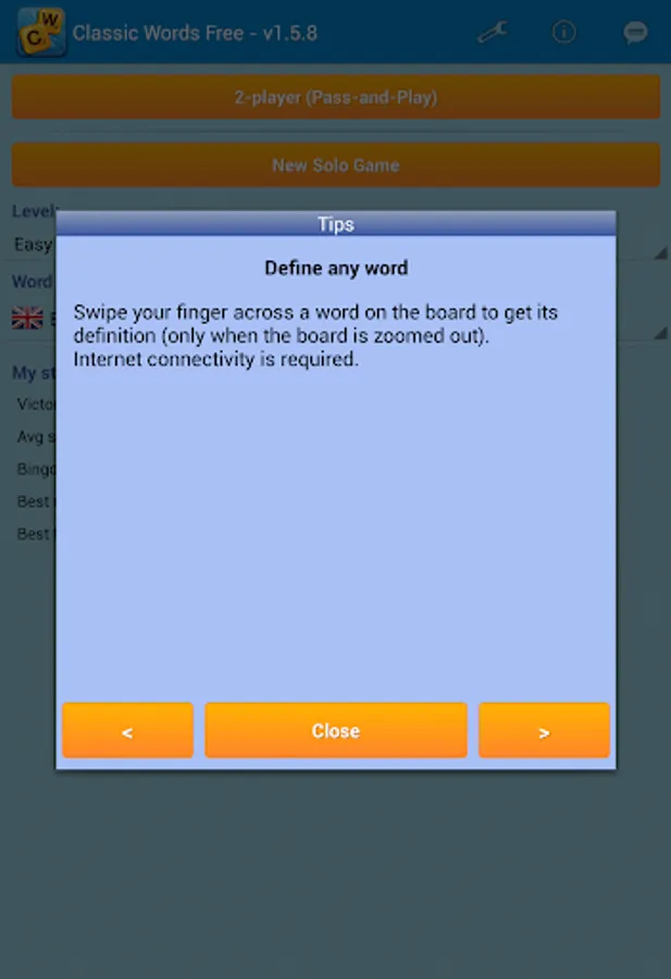 Classic Words gameplay is classical to crosswords board games: create and place words on the board and boost your score by placing letters on the high scoring Double Letter, Double Word, Triple Letter, and Triple Word squares.