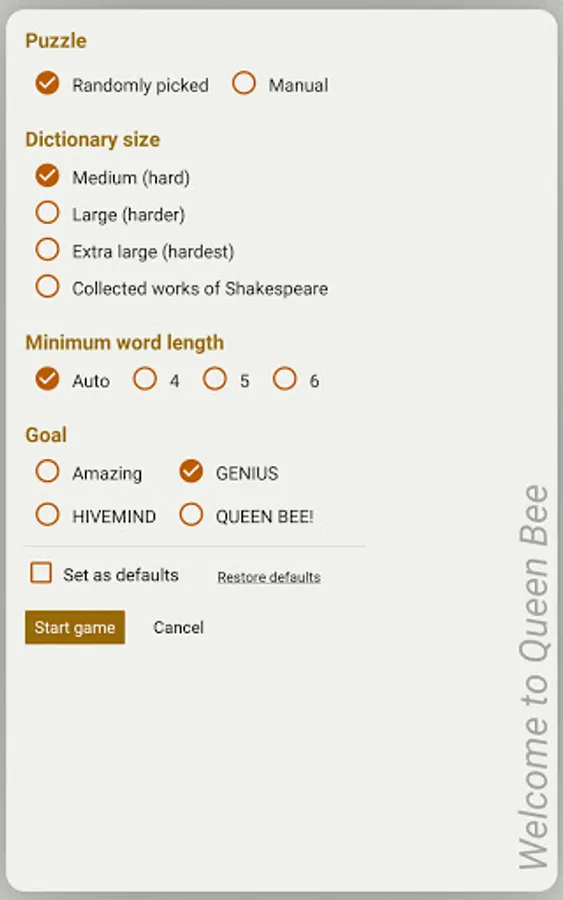 * 3 different dictionary sizes (larger dictionary = generally harder puzzles)