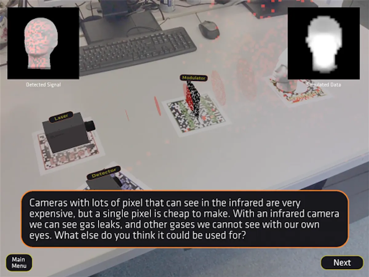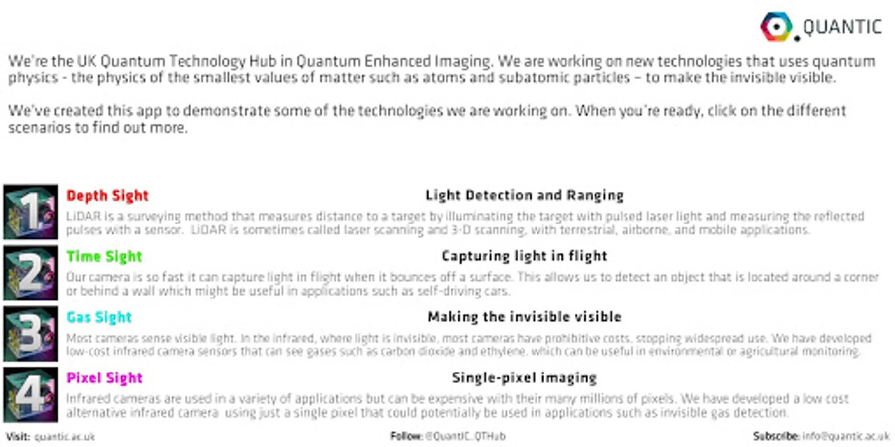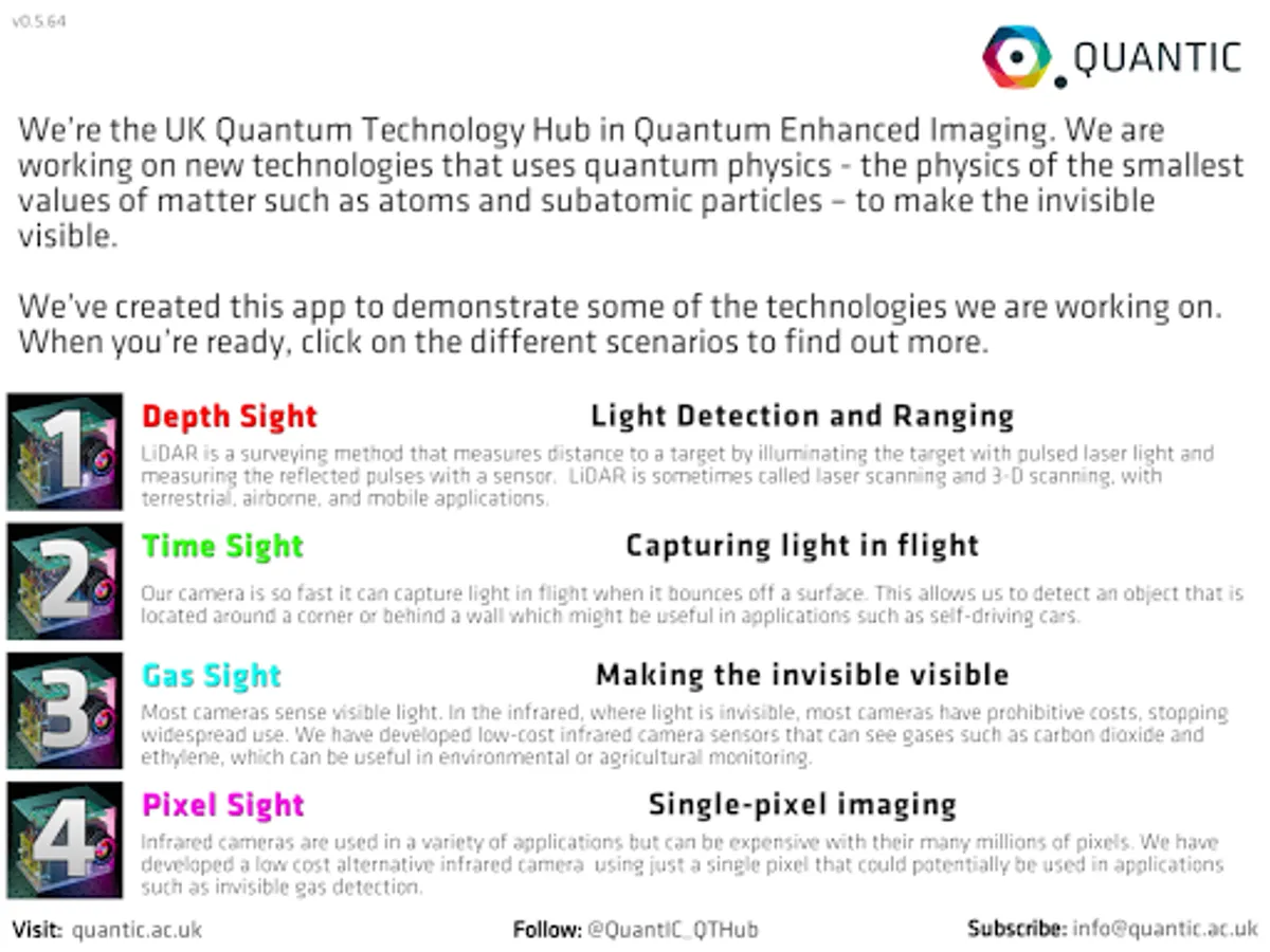 QuantIC is the UK Quantum Technology Hub in Quantum Enhanced Imaging and we’re working on new technologies that uses quantum physics – the physics of the smallest values such as atoms and photons to make the invisible visible. We’ve created this 3D augmented reality app to demonstrate some of the imaging technologies we are working on such as cameras that can see around corners and cameras that image invisible gases.