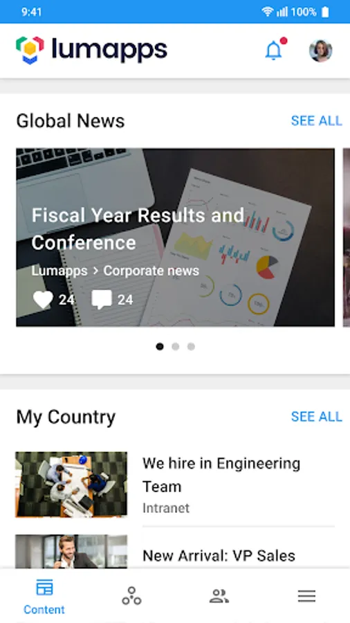 LumApps intranet solution now has a mobile companion, designed for Android! Our innovative platform provides everything you need to work in one central hub: corporate news, business tools, essential documents and social communities. Streamlining communication and collaboration is our game.