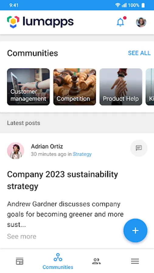 LumApps Mobile app* provides two main views, for targeted information and communities.