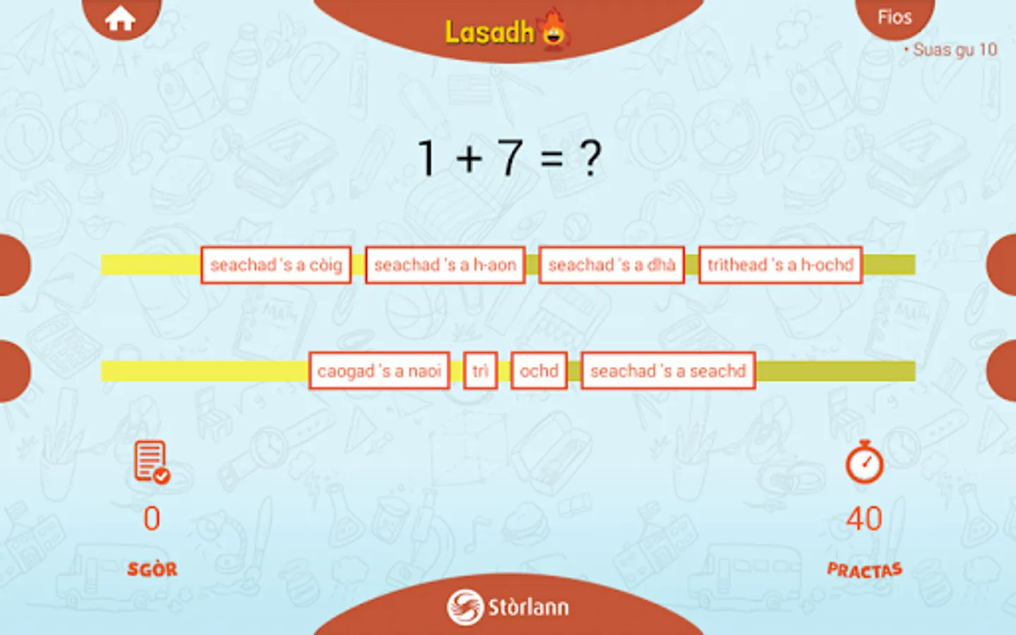 Practice basic numeracy in Scottish Gaelic. With our easy to use interactive app you can practice basic mathematics in the medium of Scottish Gaelic. There are lots of combinations of numbers and calculations for you to get your teeth into! Practice mode will help you to get started and when your up to speed switch to test mode to find out how you’re doing. The more you practice, the quicker your number skills will improve. With frequent use you will get better at understanding numbers in Scottish Gaelic. Have fun!