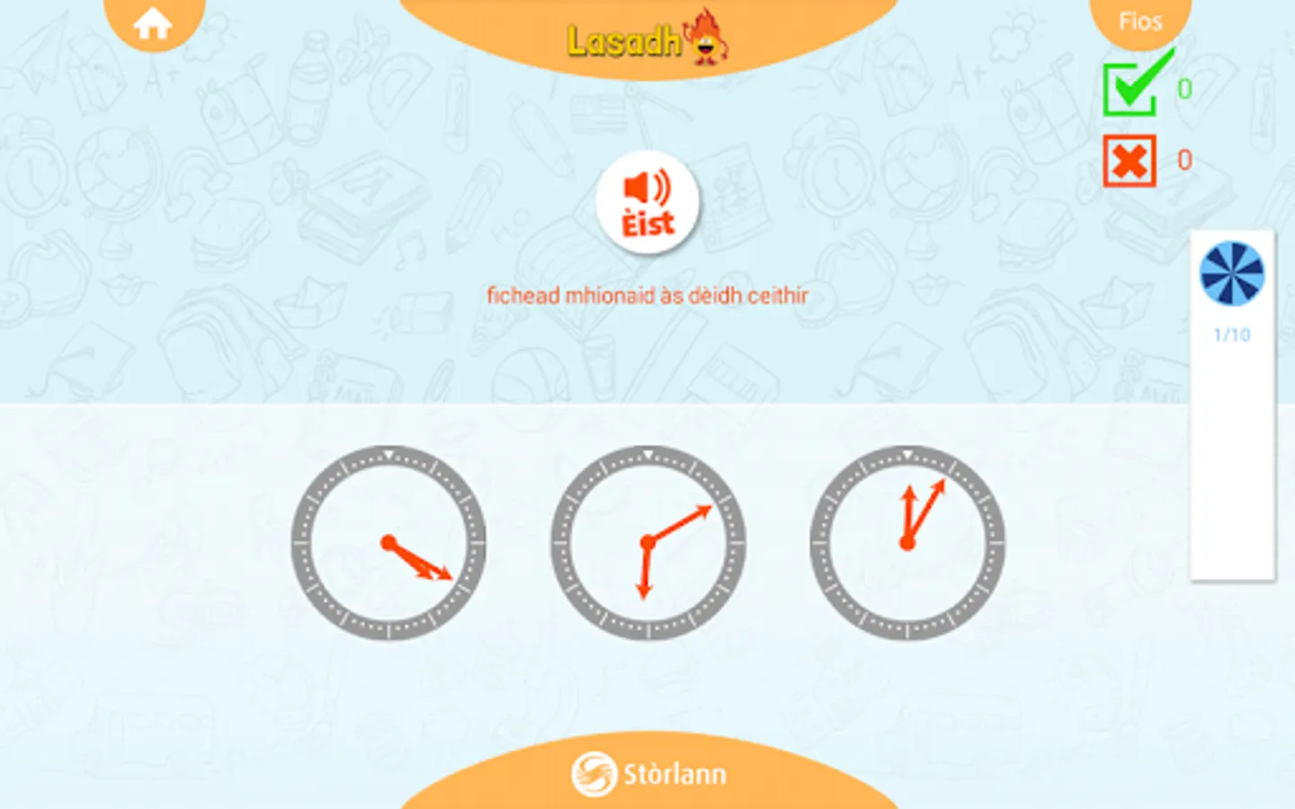 Learn to tell the Time in Scottish Gaelic. With our easy to use interactive app, you can practise listening to and reading the time in Gaelic. There are endless combinations of times and intervals for you to practise and a test mode to find out how you’re doing. The more you practise listening to the time, the quicker your skills will develop. With frequent use you will start to understand the time in Scottish Gaelic and build on your listening skills by speaking the time out loud to friends & family. Have fun!