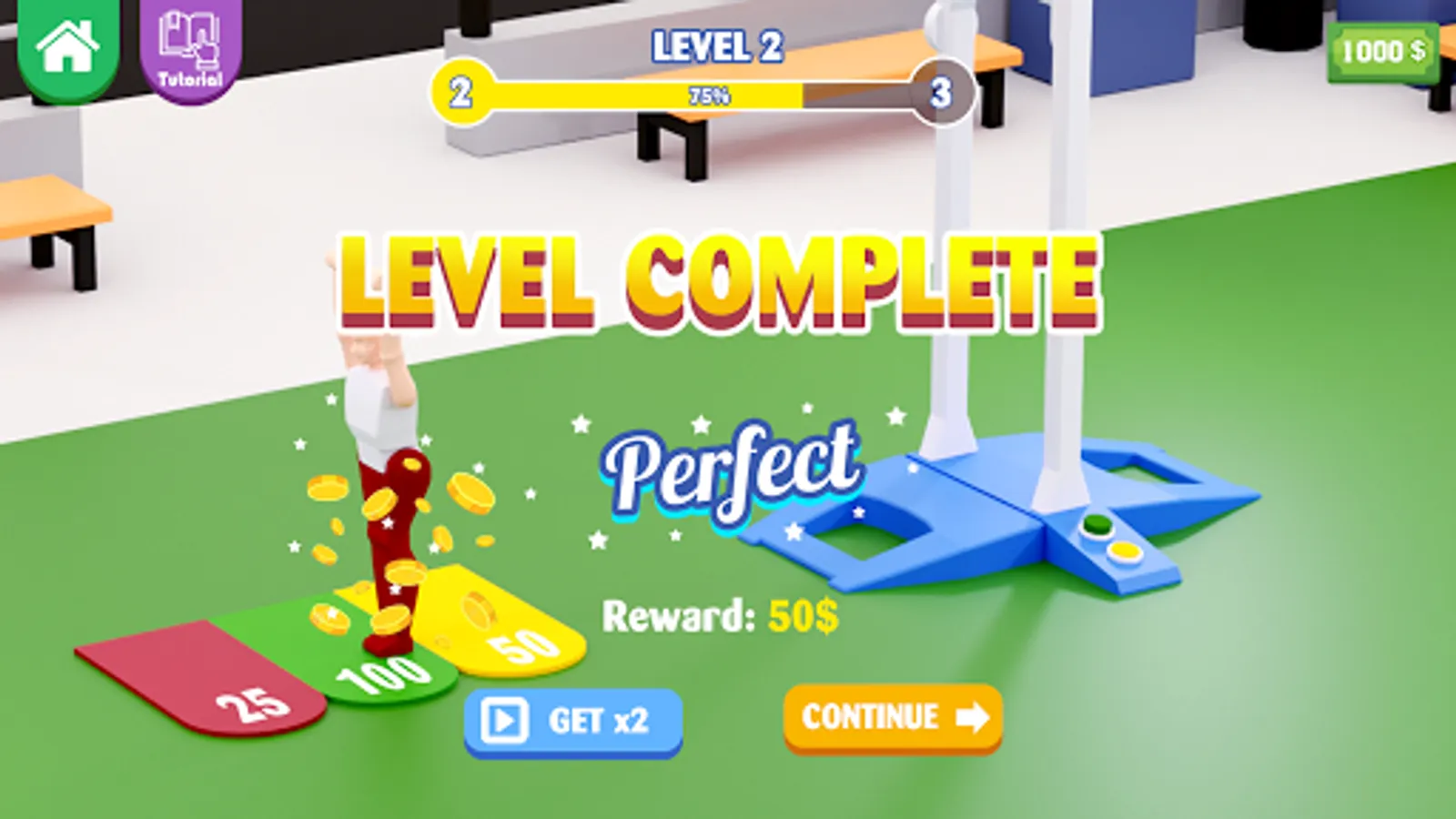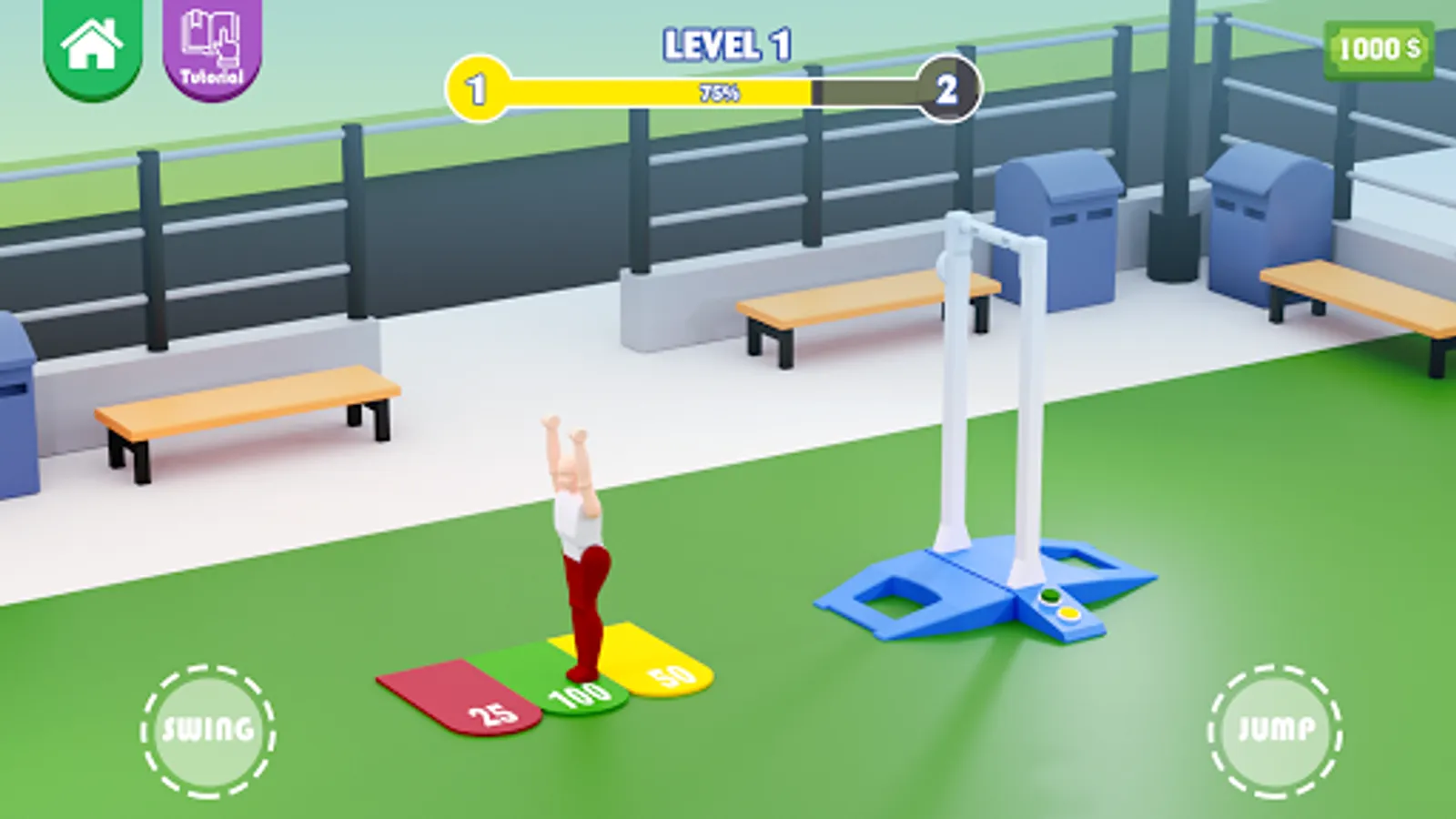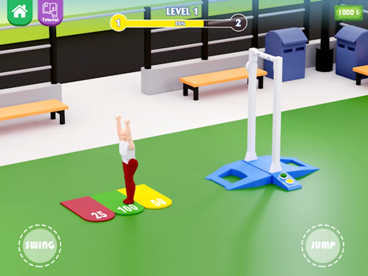 Players time their SWING button touches to gain momentum and swing the gymnast around the horizontal bar. At the right moment, hit the JUMP button to let the gymnast fly and wait for him/her to land on the best score pad. Touch down! Perfect, you are simply the best! Now collect your reward and get ready for the next round!